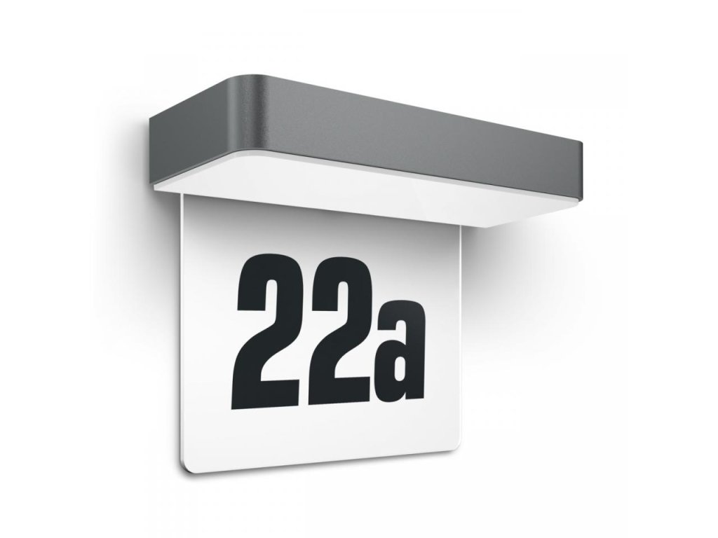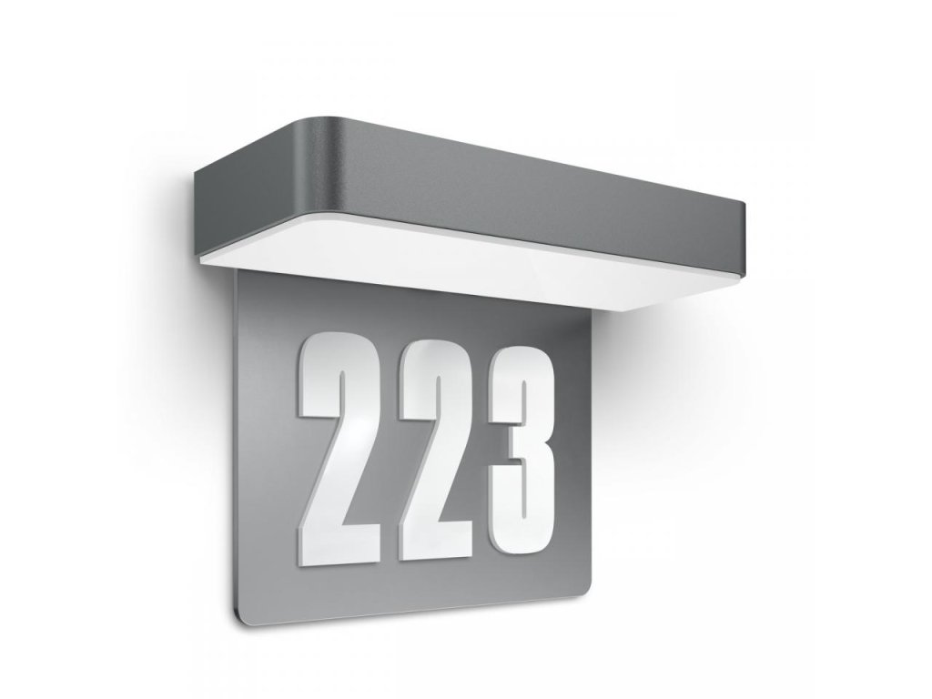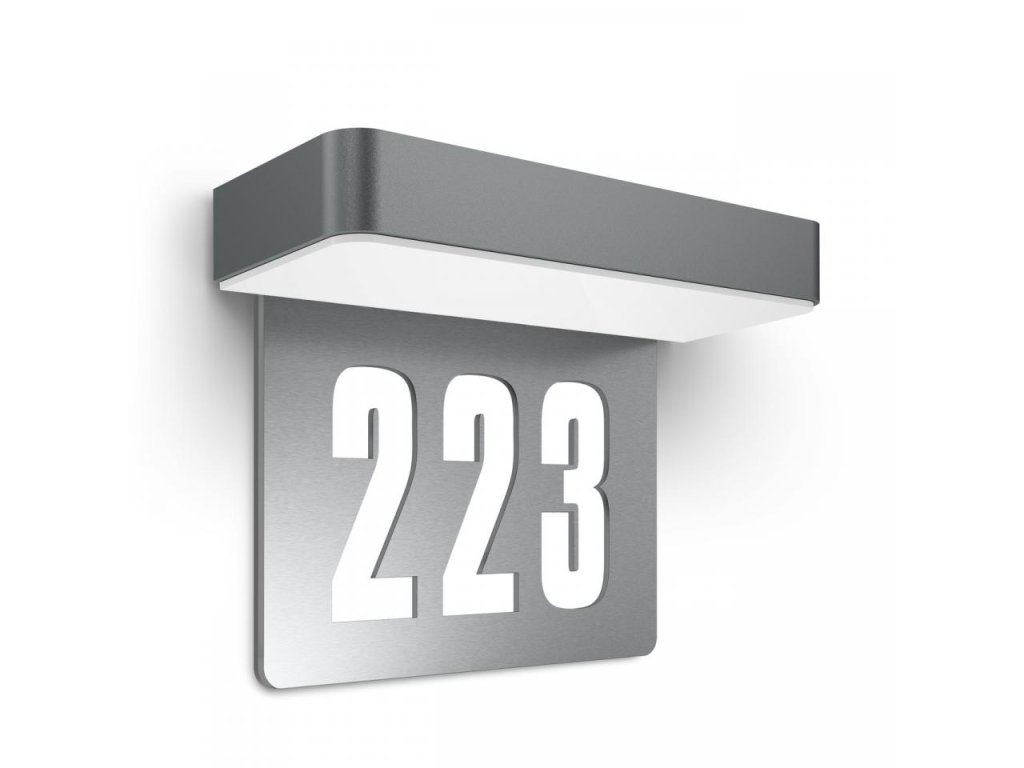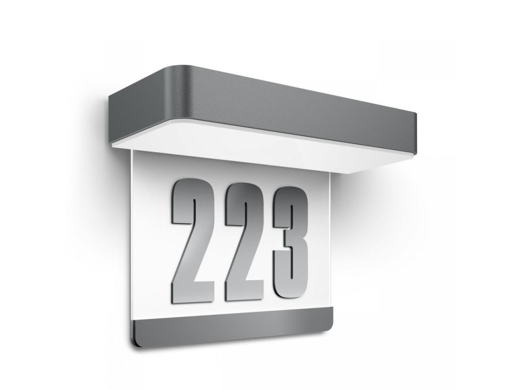 Bezdrôtové osvetlenie domového čísla. Verzia Premium Line s krytom v dizajne nerezovej ocele as vyrazeným domovým číslom vrátane vyrytého názvu ulice alebo mena rodiny. Vaše svietidlo vám bude dodané už s požadovaným číslom domu vrátane vygravírovaného názvu ulice alebo vášho mena. K dispozícii tiež bez nápisu, ako verzia domového čísla Basic Line s odolnými nalepovacími číslami domu a taktiež verzia High Line s antracitovo sfarbeným domovým číslom alebo antracitovo sfarbeným krytom s bielym domovým číslom. Vďaka súmrakovému spínaču sa osvetlenie spustí automaticky, keď sa zotmie. Automaticky aktivované svetlo s domovým číslom, nezávislé na elektrine, lítium-železná batéria pre 365 dní svietenia v roku.