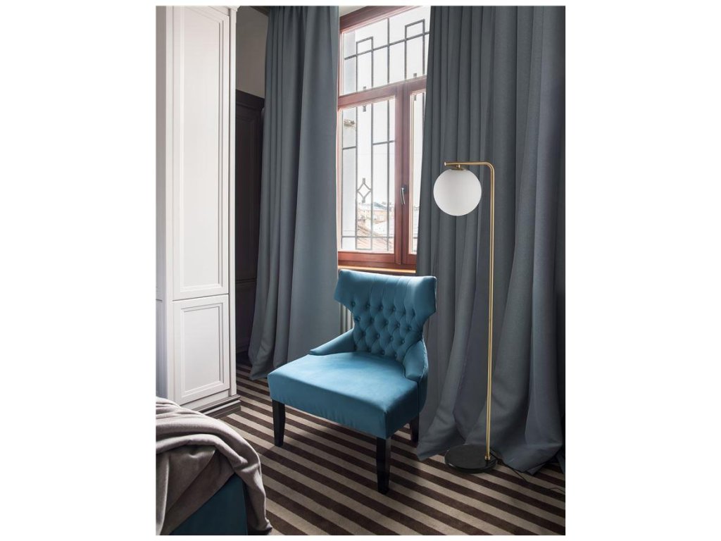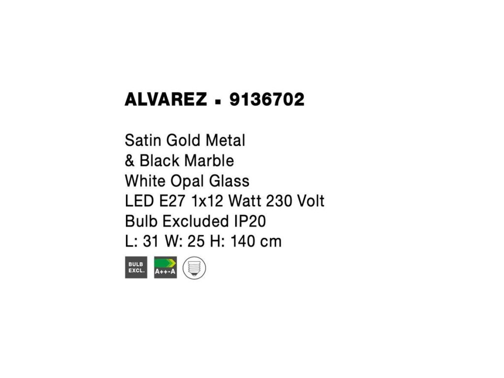Stojacia lampa ALVAREZ je k dispozícii v zlato-čiernom prevedení. Svietidlo je vyrobené z kovu, mramoru a skla. Rozmery lampy sú 31x25x140 cm. Napájací kábel má dĺžku 160 cm. Lampu odporúčame do spálne alebo do obývacej izby. Žiarovka E27 nie je súčasťou balenia.Dodatočné parametre