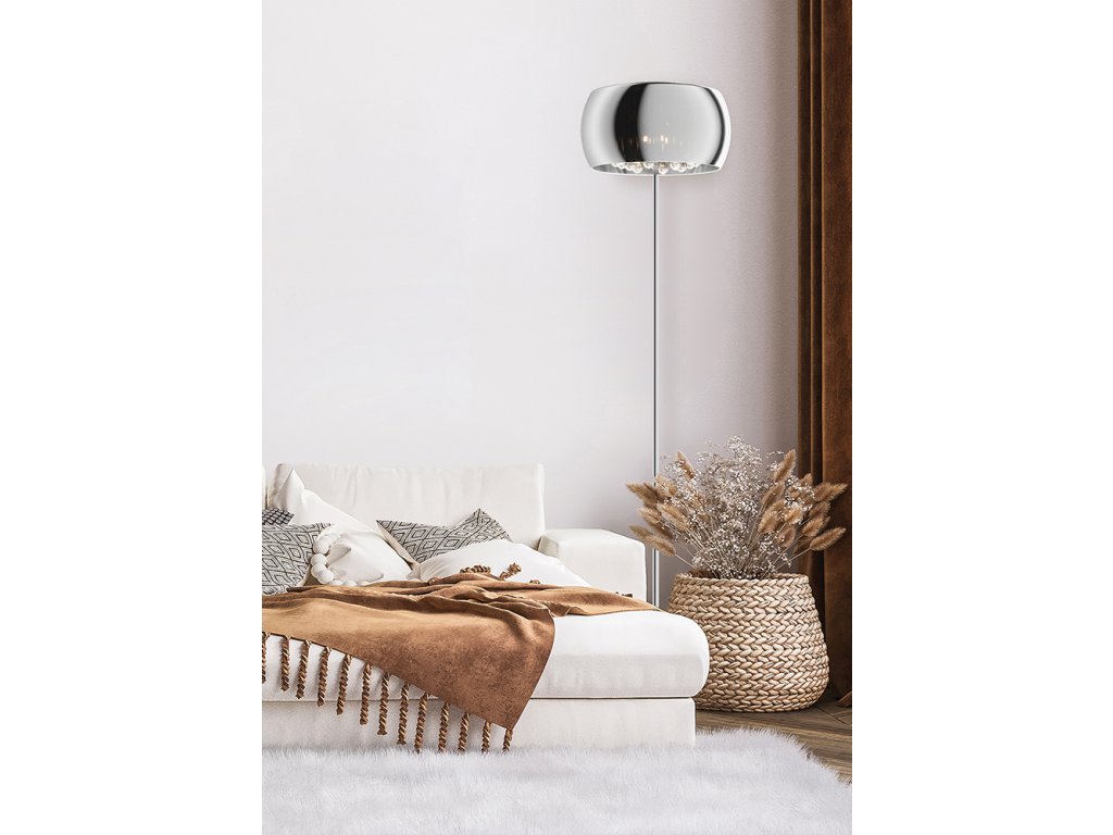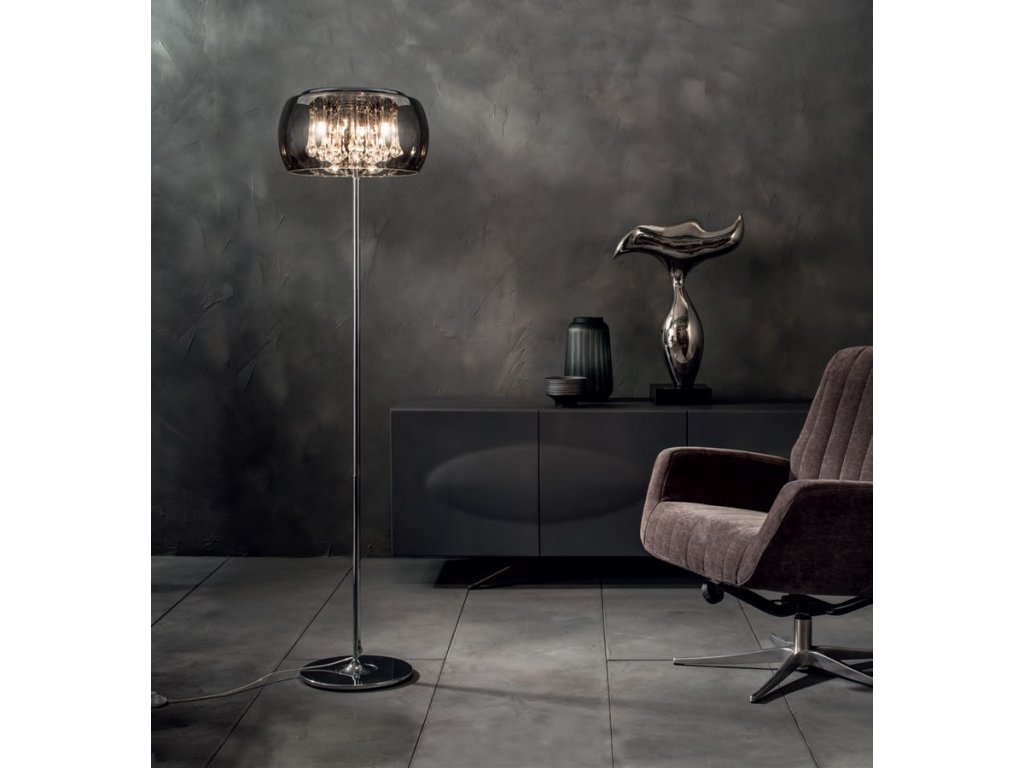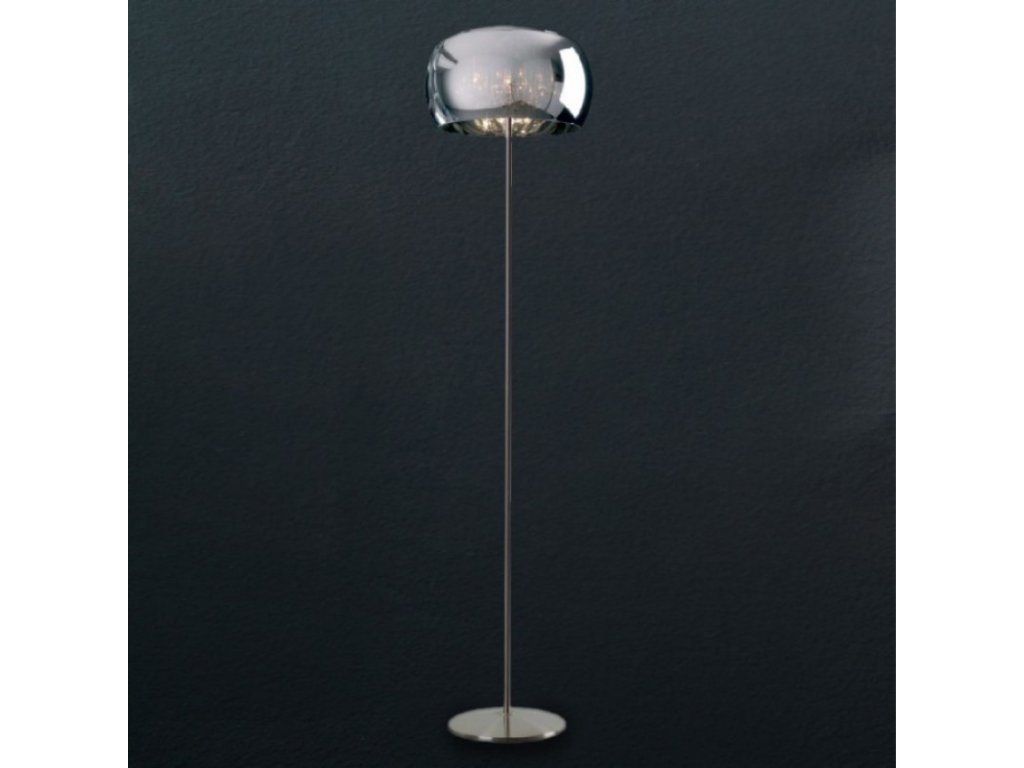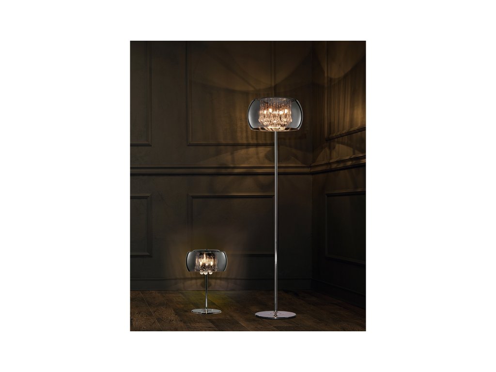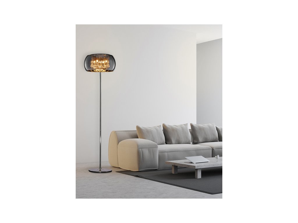 - luxusná stojaca LED lampa s chrómovým zrkadlovým skleneným tienidlom a elegantnými krištáľovými závesmi
