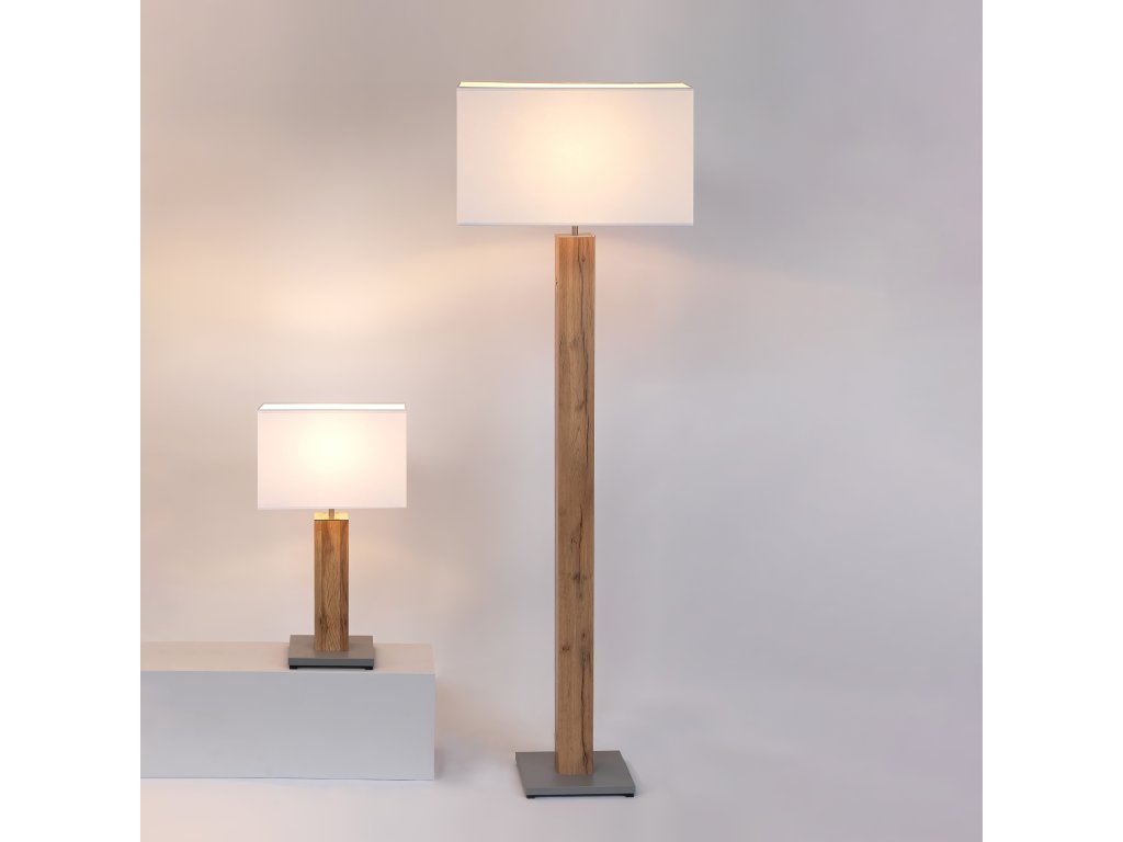 Klasická trochu masívnejšia stojaca lampa FLAME sa skladá z MDF základne, telo v tvare hranola je pokryté dubovou dyhou na ktorom je látkové hranaté tienidlo.