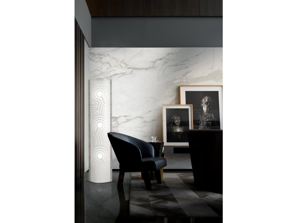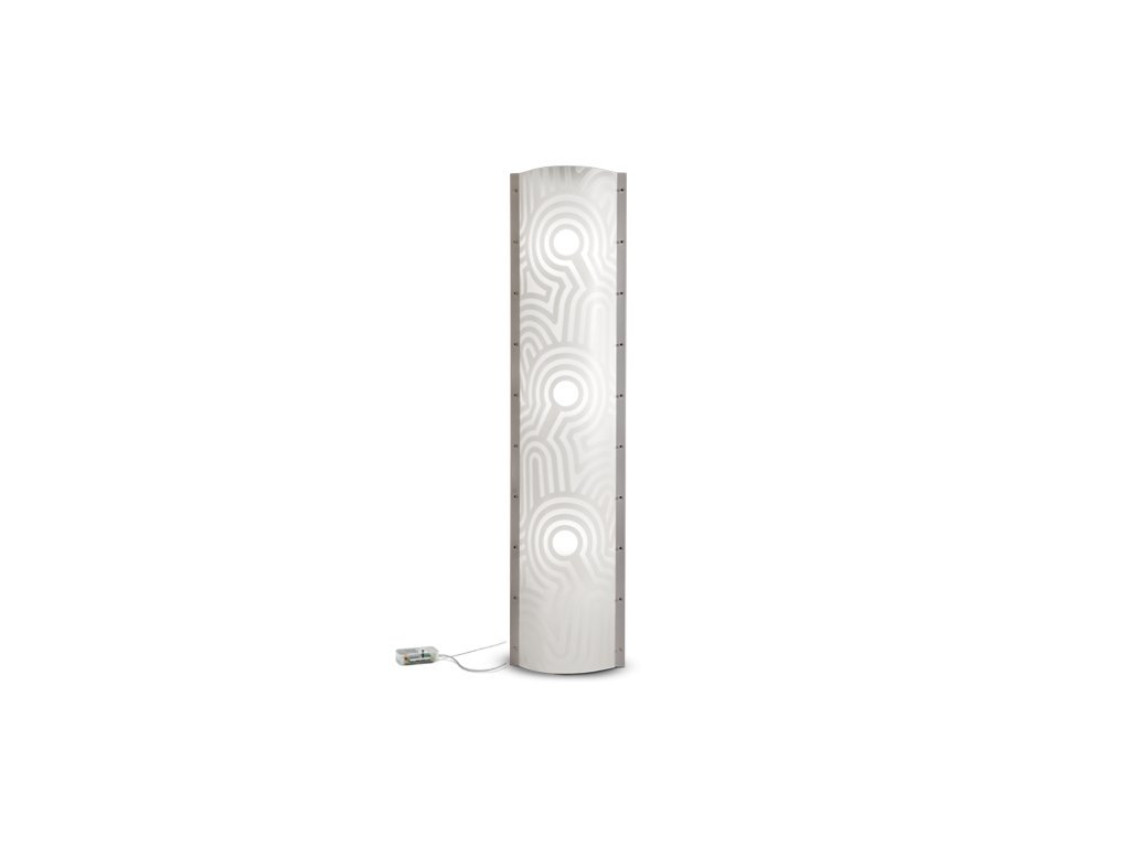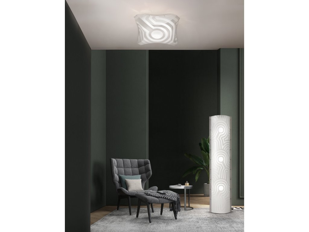 Ako kameň hodený do vody sú línie lampy mäkké a rovnomerné; sústredné kruhy, ktoré obklopujú centrálne zdroje svetla, vyžarujú smerom von. Tónované tienidlá usmerňujú vibrácie lampy a navodzujú pokojné a uvoľnené prostredie.