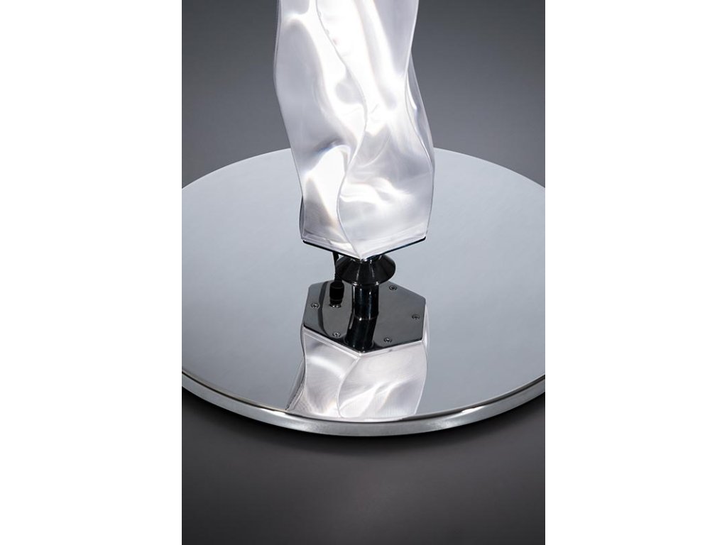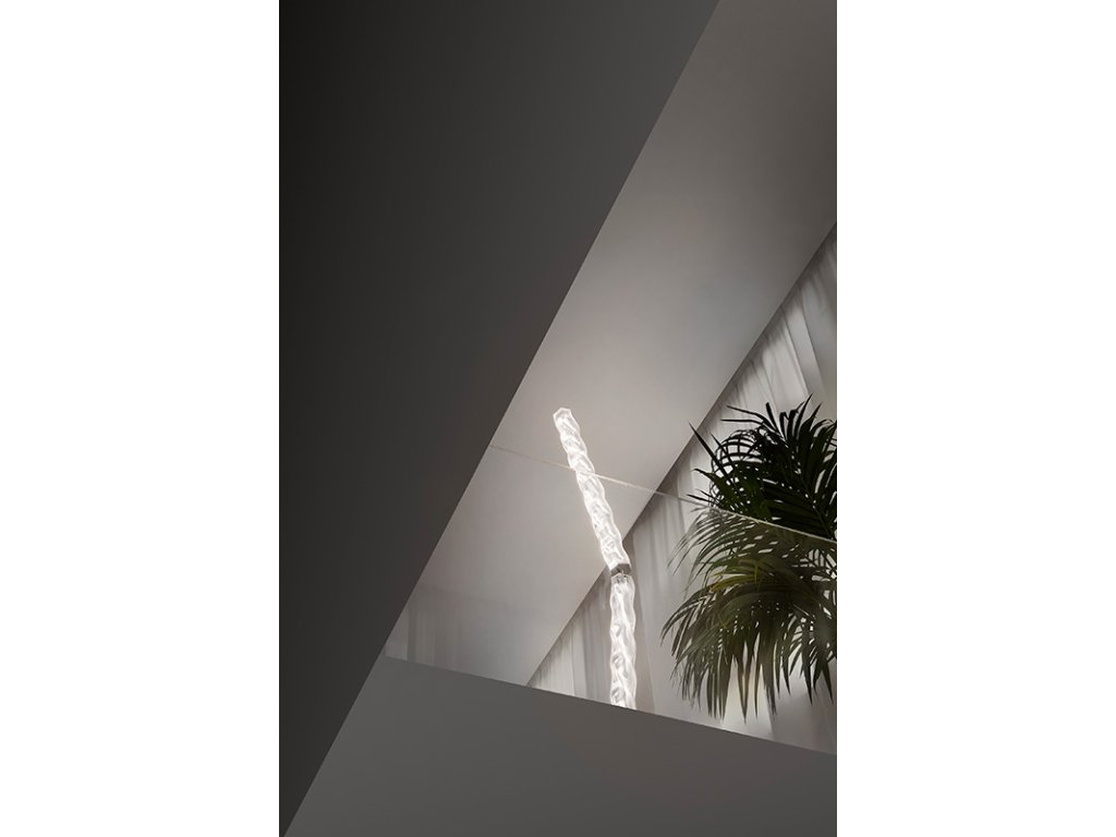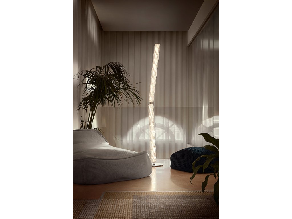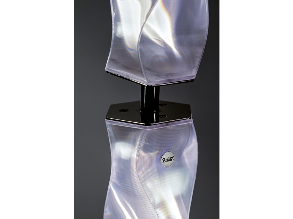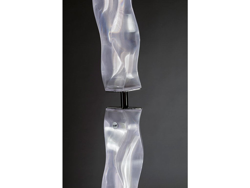 Pevný a napriek tomu tekutý: magický efekt je vytvorený neviditeľným oceľovým rámom skrytým pod vrstvami inovatívneho materiálu Lentiflex® spoločnosti Slamp, ktorý skvapalňuje osvetlenie LED. Svetlo sa premení na mäkkú, rovnomernú, takmer beztiažovú, vznášajúcu sa žiaru. Dizajn a ohyb stojacej lampy boli inšpirované natiahnutými rukami Michelangelovho obrazu "Posledný súd" v Sixtínskej kaplnke. Dotykový systém stmievania svetla je ergonomicky umiestnený a bliká, keď je lampa v minimálnom a maximálnom jase. Rovnako ako systém Hugo, Hugo Vertical a Hugo Architectural rešpektuje Hugo Floor normu UNI EN 12464 pre kancelárske osvetlenie. Transformátor sa zapája do zásuvky a kábel je čierny, aby na ňom neboli vidieť žiadne nečistoty, keď leží na podlahe. Montáž je veľmi jednoduchá: oba moduly majú vopred nastavený sklon a jednoducho sa spoja dohromady.