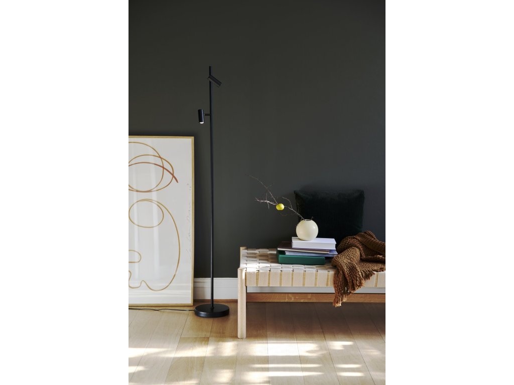 Štíhla, moderná stojaca lampa Omari je vyrobená z čierneho kovu a vyniká svojim minimalistickým dizajnom.