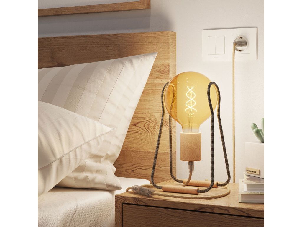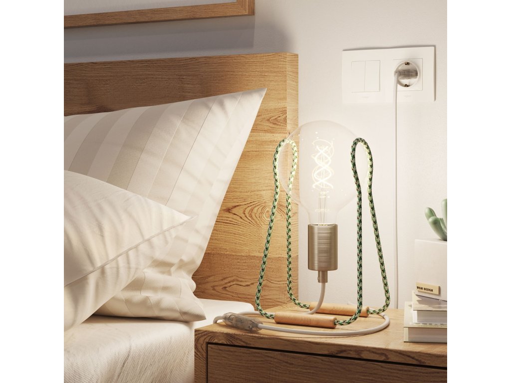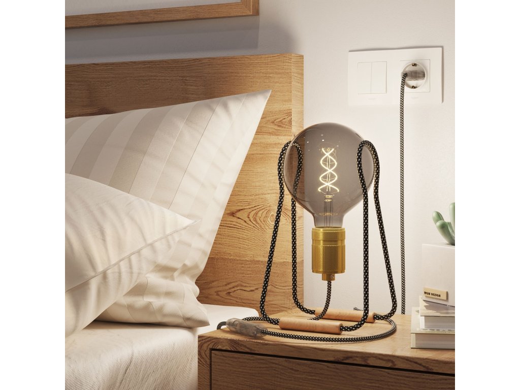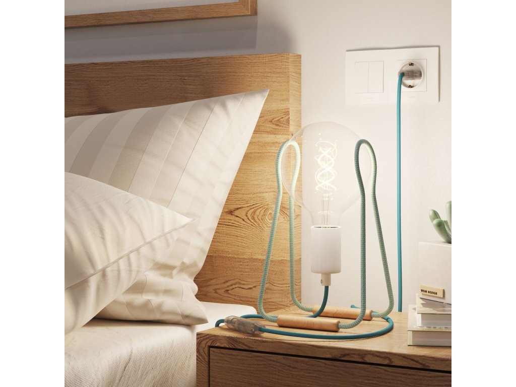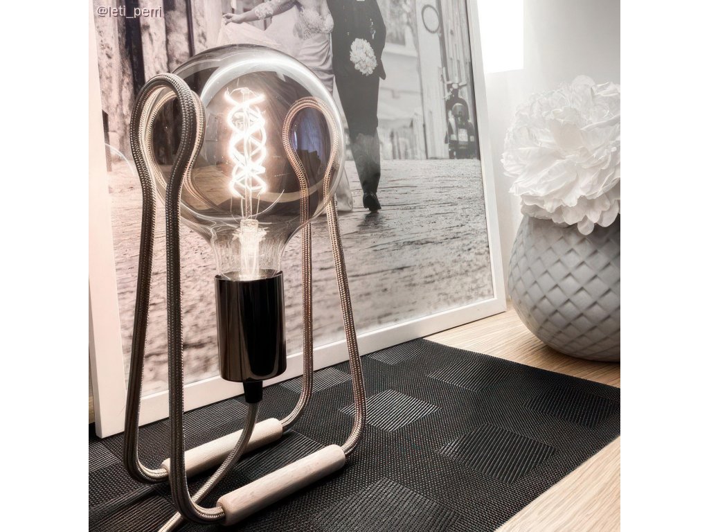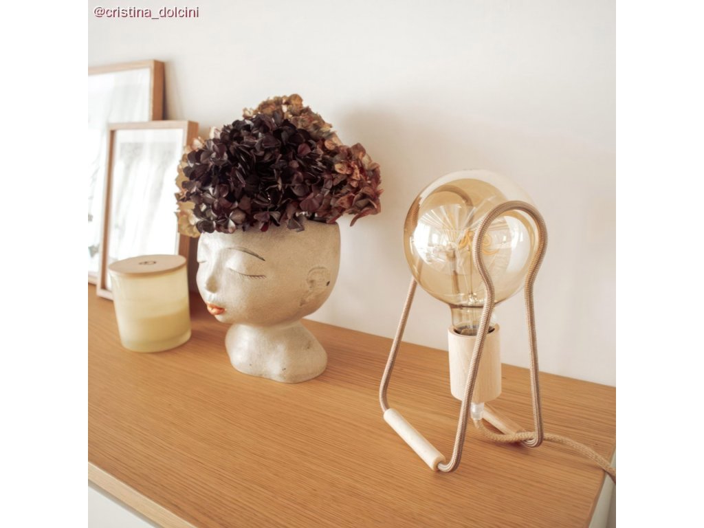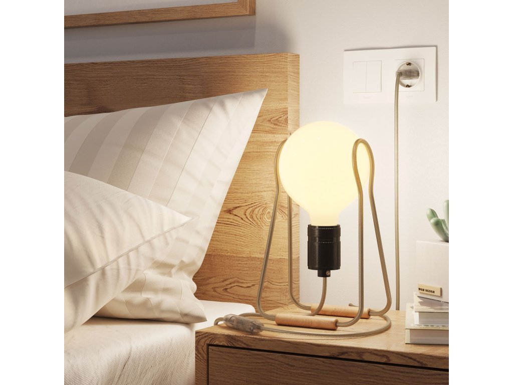 Designer Fabrizio Alessio preniesol svoju predstavu Middlebrookovej myšlienky do sveta osvetlenia a čerpal z jej elegancie a jednoduchosti. Rovnako ako kancelárska sponka zopne listy papiera, super ľahká štruktúra Taché dokáže zovrieť akúkoľvek žiarovku glóbus G125 a držať ju zavesenú a vystavenú. Taché sa skladá z dvoch zrkadlových ramien z hliníkového rámu, ktoré sú potiahnuté textíliou a doplnené o dve elegantné drevené nohy vyrobené v Taliansku. Poťah má nielen dekoratívnu funkciu, ale chráni aj povrch žiarovky. Ďalší nápad: nakombinujte svoju Taché lampu s jedným z našich skompletovaných SnakeBis káblov a vytvorte tak praktickú, modernú a nápaditú dizajnovú stolovú lampu.
