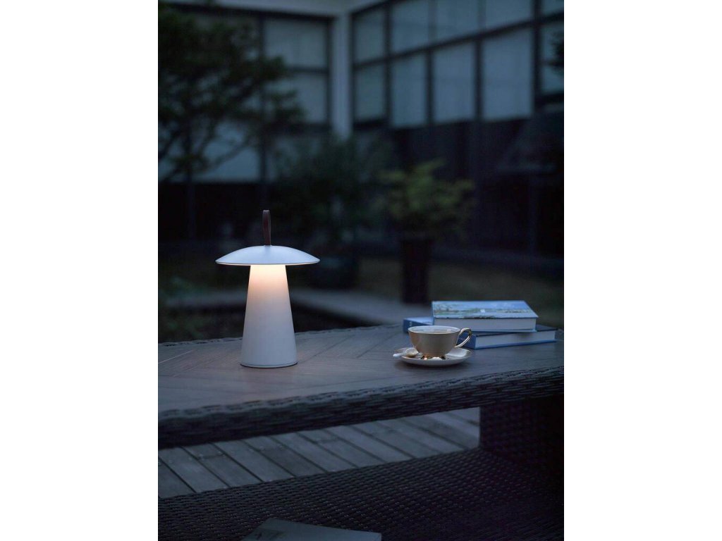 Táto malá prenosná stolná lampa Ara, vyrobená z hliníka, je ideálna na osvetlenie teplých letných nocí na vašom balkóne alebo terase.