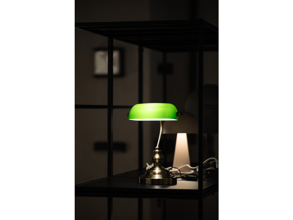Elegantná stolná lampa z kolekcie interiérového osvetlenia značky Ideal Lux v retro dizajne vhodná do obývacích izieb, pracovní, hotelových interiérov, knižníc alebo študovní. Základňa stolnej lampičky s priemerom 26 cm je zhotovená z kvalitného kovu s mosadznou povrchovou úpravou. Tienidlo je vyrobené z fúkaného skla v netradičnej zelenej farbe. Vypínač je umiestnený na prívodnom kábli lampy. Svietidlo je osadené päticou E27 pre žiarovku s maximálnym príkonom 1 x 60 W. Žiarovka nie je súčasťou balenia, odporúčame zvoliť LED žiarovku, ktorá znižuje náklady na elektrickú energiu. Krytie IP20 je vhodné na použitie do interiéru. Jej celkové rozmery sú 38 x 26 x 26 cm. Je určená na napájanie zo siete na 220-240 V a vzťahuje sa na ňu predĺžená záruka 5 rokov.Dodatočné parametre