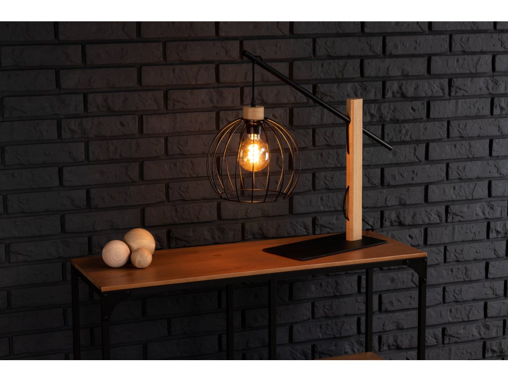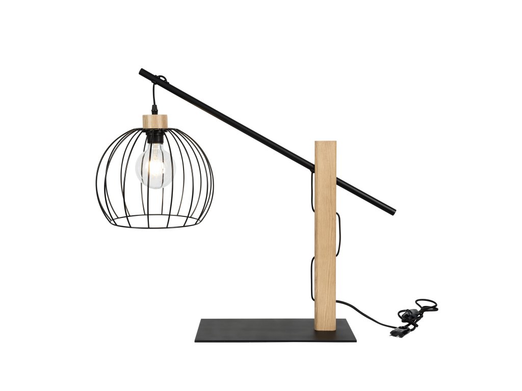 Stolová lampa MANDARINE a jej elegantná kombinácia dubového či bukového dreva a čierneho kovového tienidla v tvare klietky, dodáva tejto stolnej lampe nadčasový dizajn a tvorí tak štýlové a moderné riešenie osvetlenia vnútorných priestorov.