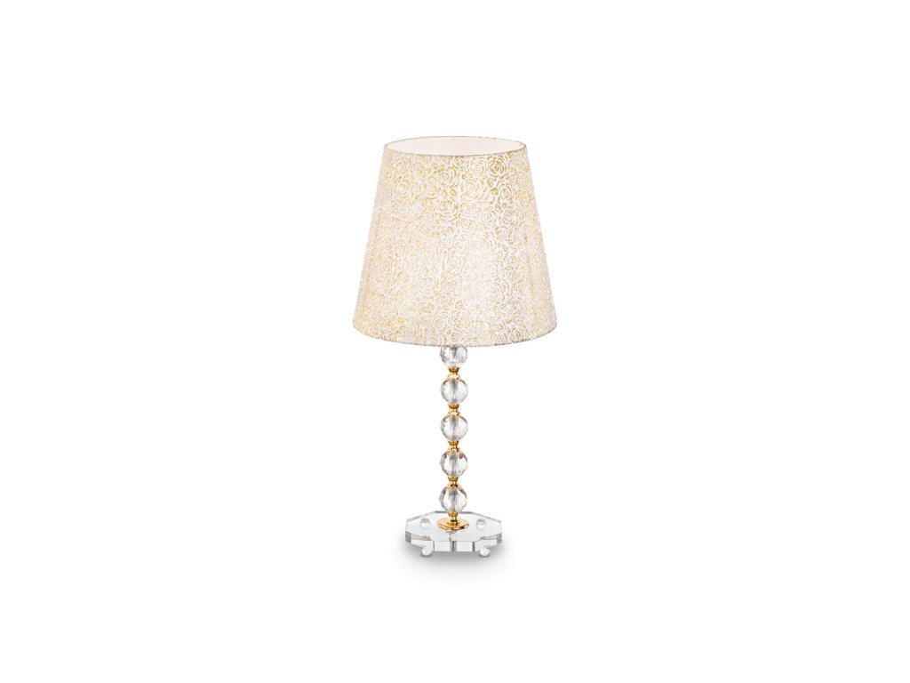 Luxusná stolná lampa Queen z kolekcie interiérového osvetlenia značky Ideal Lux v zlatom prevedení perfektne nasvietia tmavé kúty v obývacej izbe, spálni či pracovni alebo hotelové interiéry v klasickom aj modernom štýle. Pozlátený rám svietidla je zhotovený z kvalitného kovu a je doplnený o brúsený krištáľový podstavec s ozdobnými prvkami. Tienidlo z PVC fólie je pokryté prešívanou dekoráciou a zlatými trblietkami. Svietidlo je osadené päticou E27 pre žiarovku s maximálnym príkonom 1 x 60 W. Zdroj nie je súčasťou balenia. Odporúčame zvoliť LED žiarovku na úsporu elektrickej energie. Krytie IP20 je vhodné na použitie do interiéru. Na prívodnom kábli je umiestnený vypínač. Celkové rozmery sú 67,5 x 35 x 35 cm. Svietidlo je určené na napájanie zo siete na 220-240 V a vzťahuje sa naň predĺžená záruka 5 rokov.Dodatočné parametre