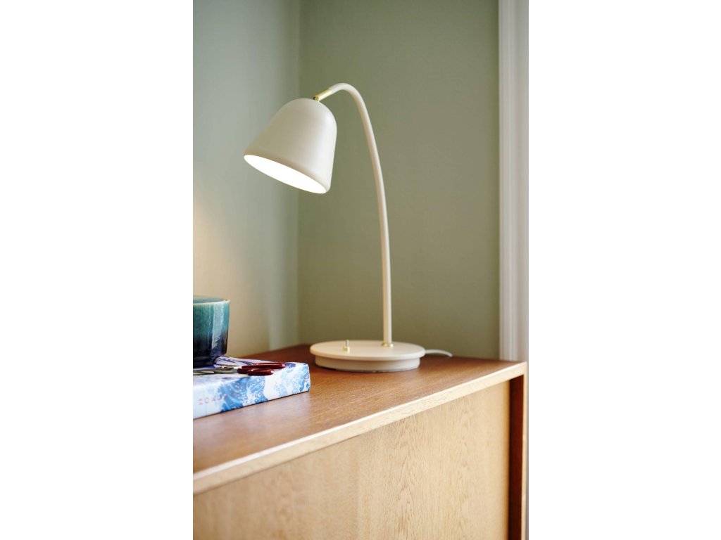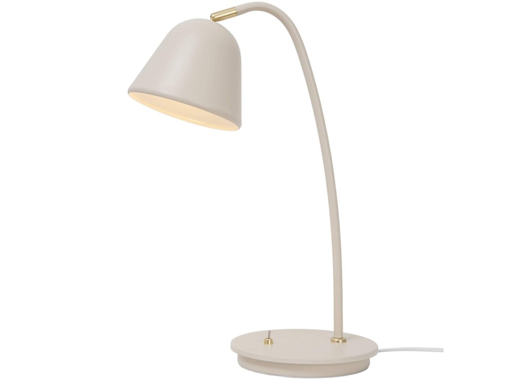 Béžová stolná lampa v práškovej farbe je zdobená krásnymi mosadznými detailmi.