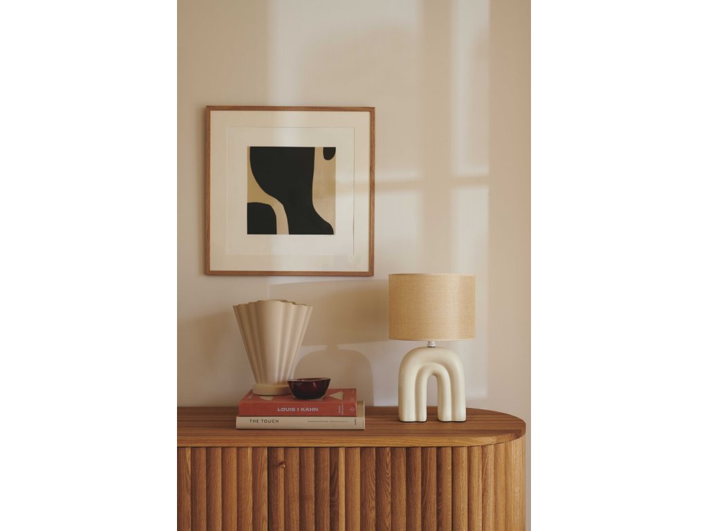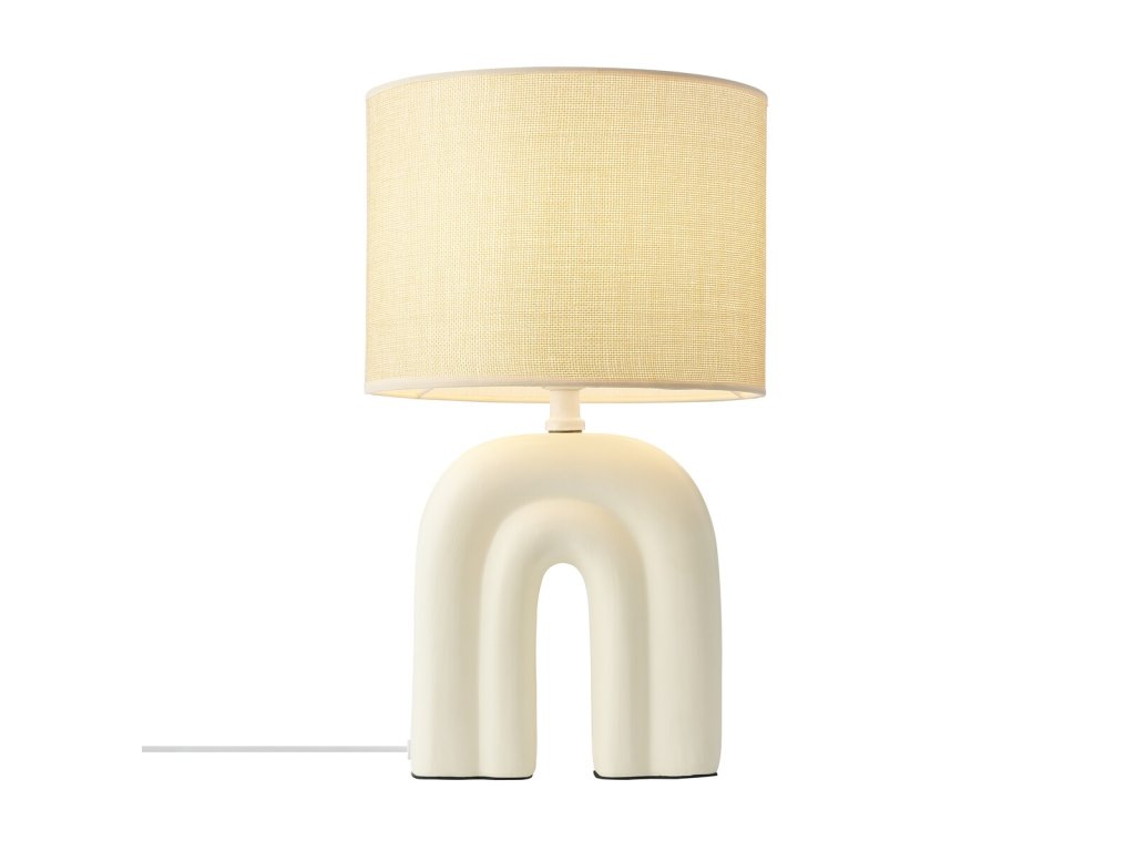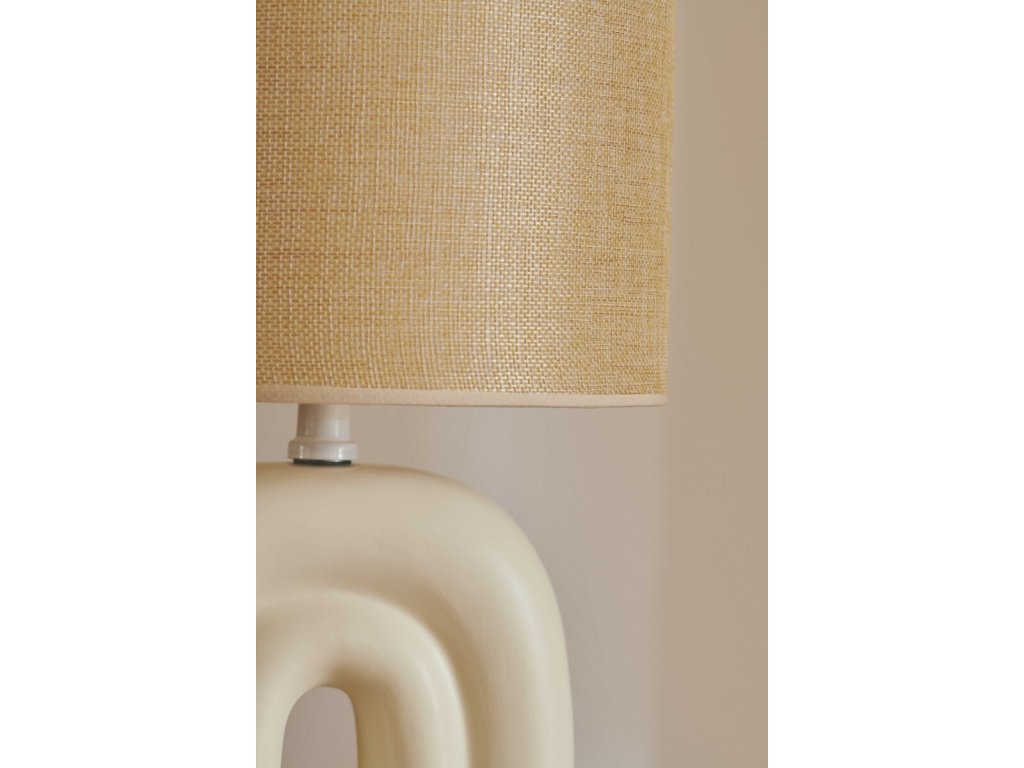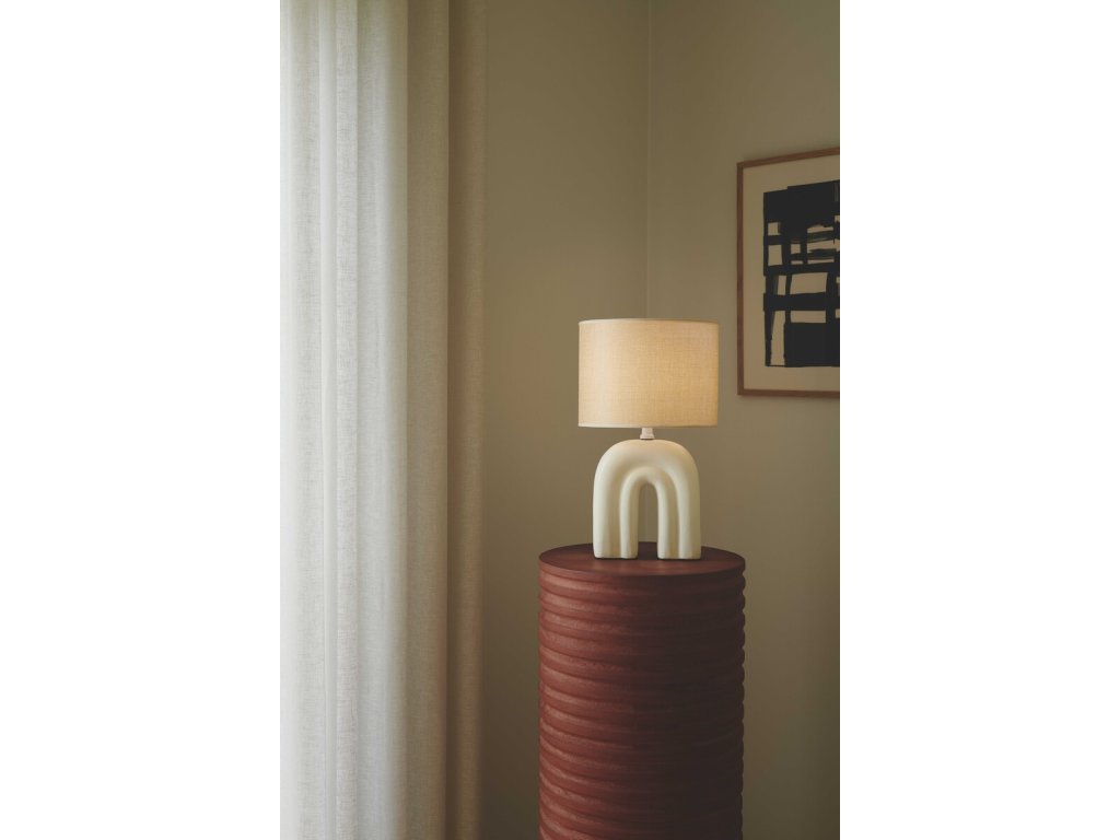 Haze je krásne tvarovaná stolná lampa s krásnou kombináciou keramiky a ľanu. Tvar takmer pripomína dúhu v jemnej béžovej farbe. Tienidlo zaisťuje veľmi príjemné, teplé svetlo.