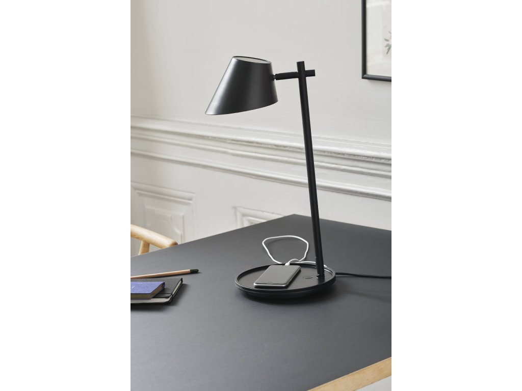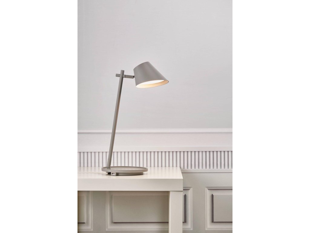 Nápaditá matná stolná lampa Stay z dielne Márii Berntsen s kónickým asymetrickým tienidlom a odkladacou základňou. Tienidlo je možné naklápať, môžete si tak svetlo smerovať podľa svojich potrieb a vytvoriť si optimálne svetelné podmienky. Súčasťou je kvalitný úsporný LED zdroj a navyše je tu pripravené USB, ktoré využijete napríklad na nabitie svojho mobilného telefónu. Ponúkame v matnej čiernej alebo šedej farbe. Svietidlo sa bude vynímať v odpočinkovej časti obývacej miestnosti, v spálni, v pracovni alebo detskej izbe.
