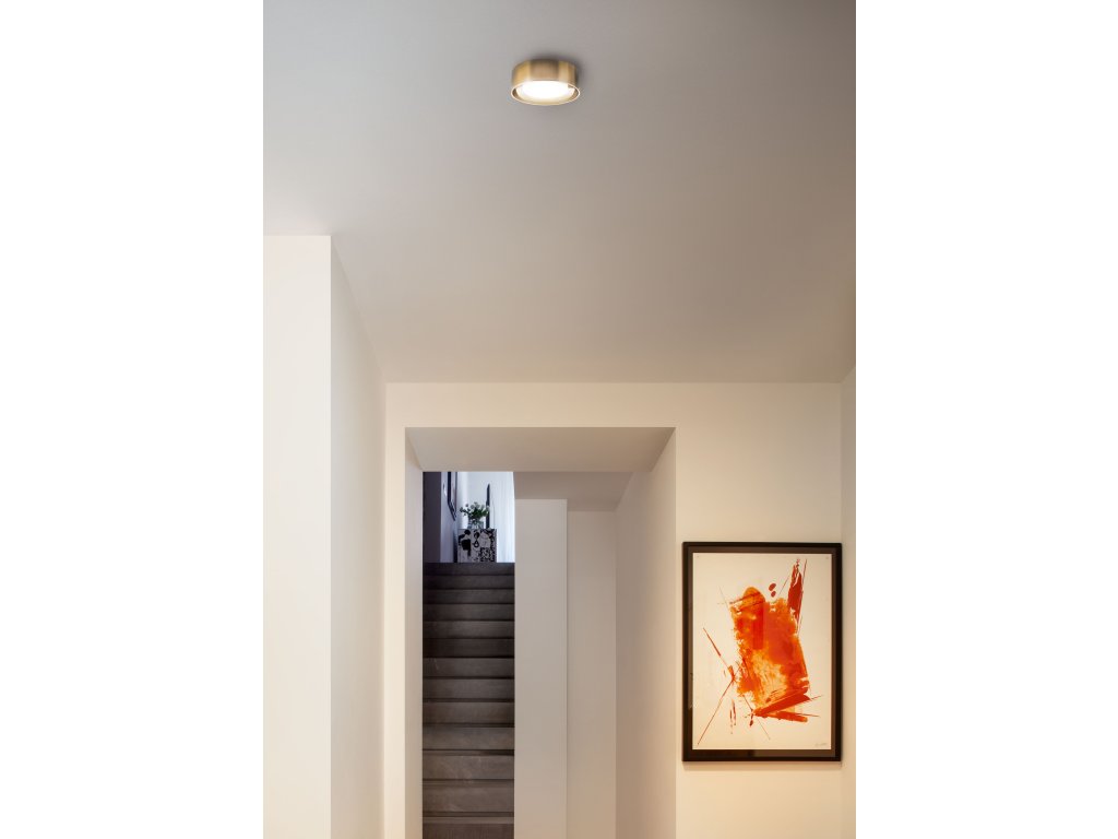 Stropné interiérové svietidlo vybavené SMD LED, kovová konštrukcia lakovaná pieskovo čiernou, bielou alebo mosadznou farbou, akrylový difúzor.