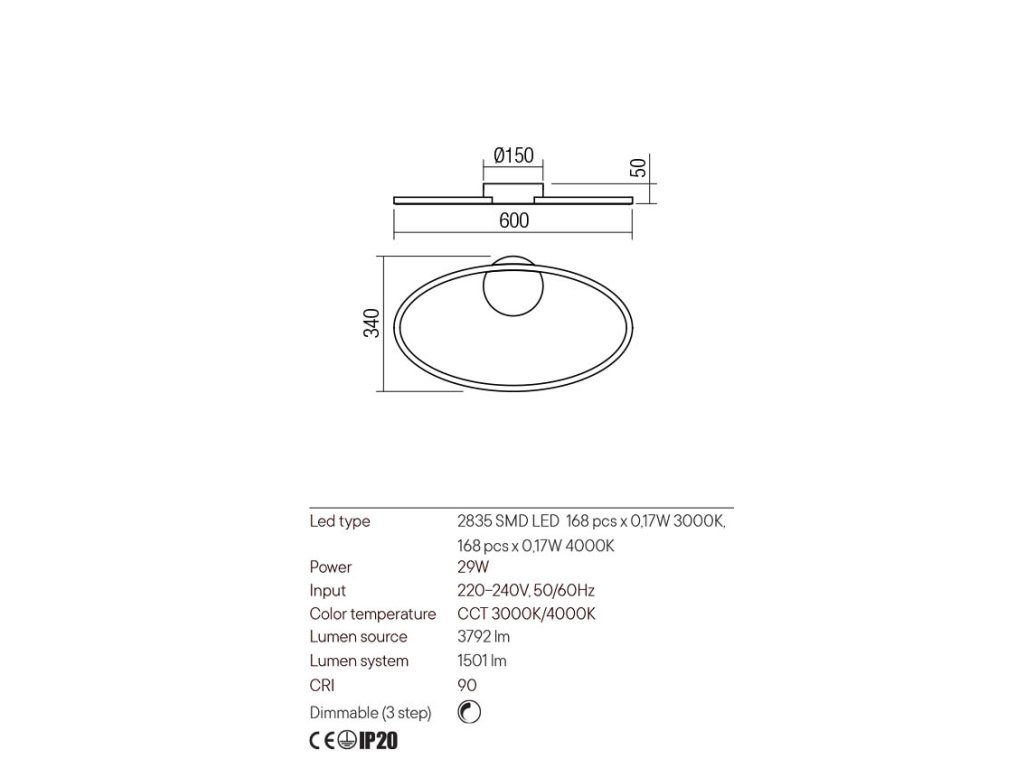 Stropné interiérové svietidlo vybavené LED diódami SMD s možnosťou voľby teploty farby svetla. Hliníková a kovová konštrukcia s povrchovou úpravou vo viacerých farebných variantách, matný biely PVC difúzor.