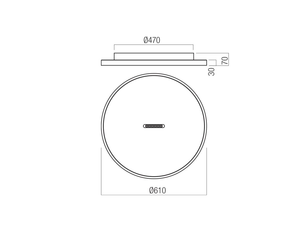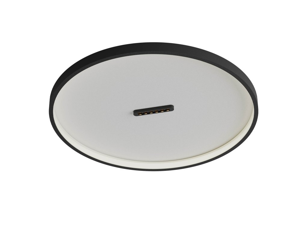 Interiérové stropné svietidlo, stmievateľné pomocou trojstupňového stmievacieho spínača, osadené SMD LED diódami, kovová a hliníková konštrukcia elektrostaticky lakovaná zvonku pieskovo čiernou alebo bielou farbou a zvnútra matne bielou farbou s matne čiernym stredovým prvkom, opálový PVC.