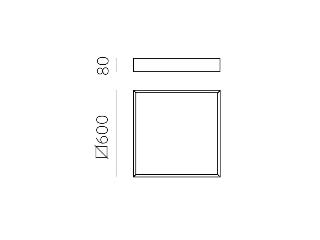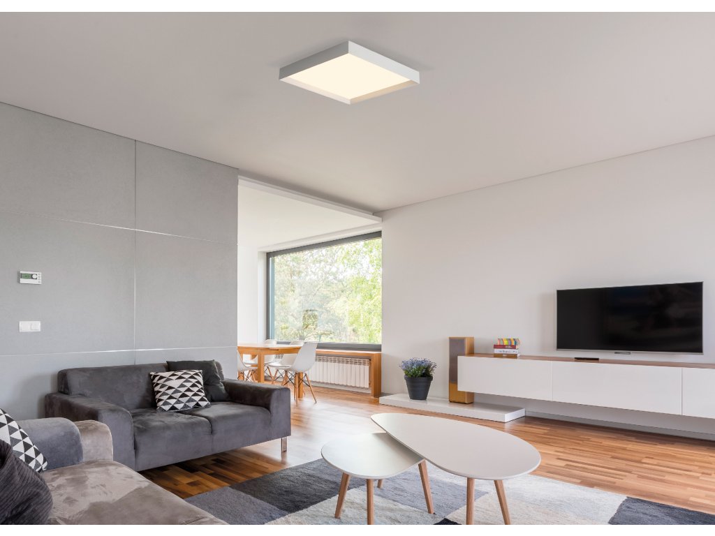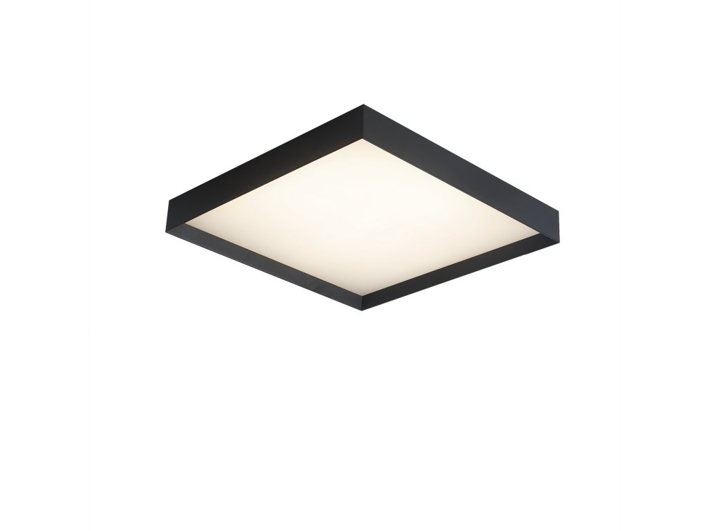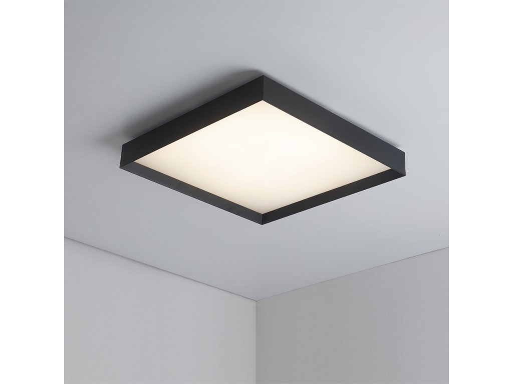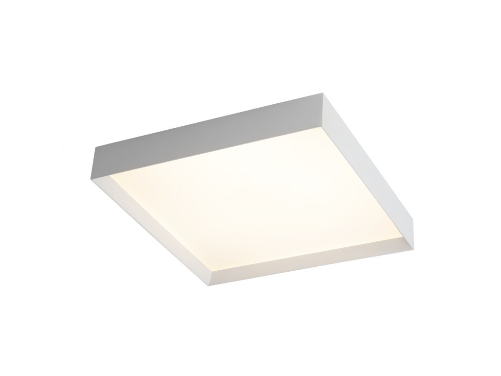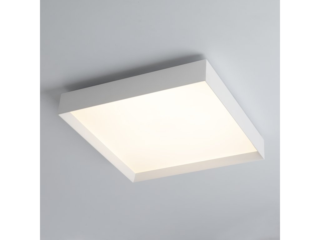 Moderné a elegantné stropné LED svietidlo v tvare štvorca s mierne zapusteným difúzorom vzhľadom k rámu.