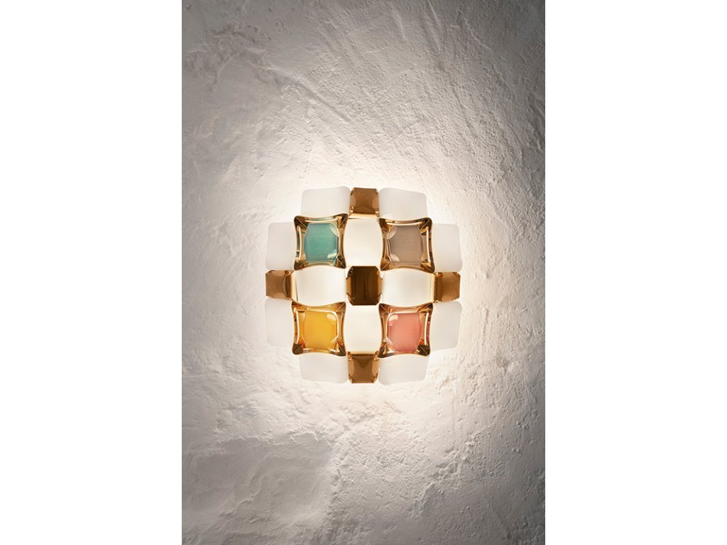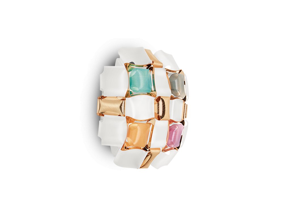Mida sa inšpiruje svetom šperkov haute couture. Pavéza z drahých kameňov pokrýva takmer neviditeľnú súpravu a leštené kabošony sú geometricky rozptýlené v kvetinovej korune s hodvábnymi, dúhovými tónmi. Dizajnérka použila farebné a kovové drahokamy, aby oživila kolekciu 3 veľkostí a 5 farebných kombinácií; každá z nich je ručne vyrobená a má integrovaný magnetický systém, ktorý uľahčuje inštaláciu a údržbu.