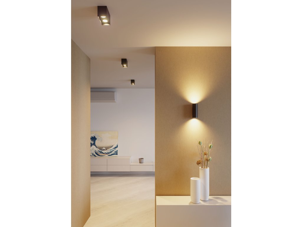 Stropné svietidlo do interiéru, konštrukcia z kovu a lisovaného hliníka, elektrostaticky lakované zvonku vo viacerých farebných variantoch a zvnútra matnou čiernou farbou. Zdroj GU10 nie je súčasťou balenia.