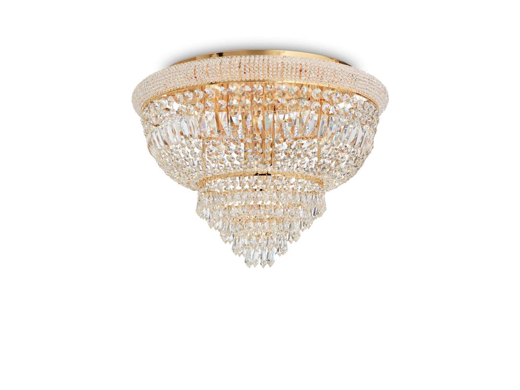 Elegantné stropné prisadené svietidlo Dubai PL24 z kolekcie interiérového osvetlenia Ideal Lux v najväčšom prevedení s priemerom 78 cm vhodne doladí každý interiér v modernom aj klasickom štýle. Ideálne rozsvietia haly, obývacie priestory alebo hotelové interiéry. Svietidlo tvorí kovový rám s lesklou zlatou povrchovou úpravou, ktorý je dookola ozdobený dekoratívnymi prvkami z brúseného číreho krištáľu v tvare osemuholníkov a hranolov. Štýlové svietidlo je osadené päticami E14 s maximálnym príkonom 24 x 40 W. Žiarovky nie sú súčasťou balenia. Odporúčame použiť úsporné LED svetelné zdroje s dlhou životnosťou. Dodávateľ odporúča LED filamentové žiarovky (obj. kód 101224) s príkonom 4W a teplotou chromatickosti 3000K (neutrálne biele svetlo). Krytie IP20 je vhodné na použitie do interiéru.Dodatočné parametre
