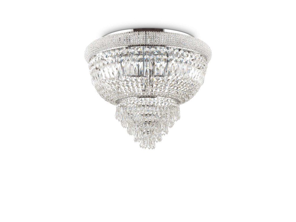 Elegantné stropné prisadené svietidlo DUBAI PL6 z kolekcie interiérového osvetlenia Ideal Lux v strednom chrómovom prevedení s priemerom 52 cm vhodne doladí každý interiér v modernom aj klasickom štýle. Ideálne rozsvietia haly, obývacie priestory alebo hotelové interiéry. Svietidlo tvorí kovový rám s lesklou chrómovou povrchovou úpravou, ktorý je dookola ozdobený dekoratívnymi prvkami z brúseného číreho krištáľu v tvare osemuholníkov a hranolov. Štýlové svietidlo je osadené päticami E14 s maximálnym príkonom 6 x 40 W. Žiarovky nie sú súčasťou balenia. Odporúčame použiť úsporné LED svetelné zdroje s dlhou životnosťou. Krytie IP20 je vhodné na použitie do interiéru.Dodatočné parametre