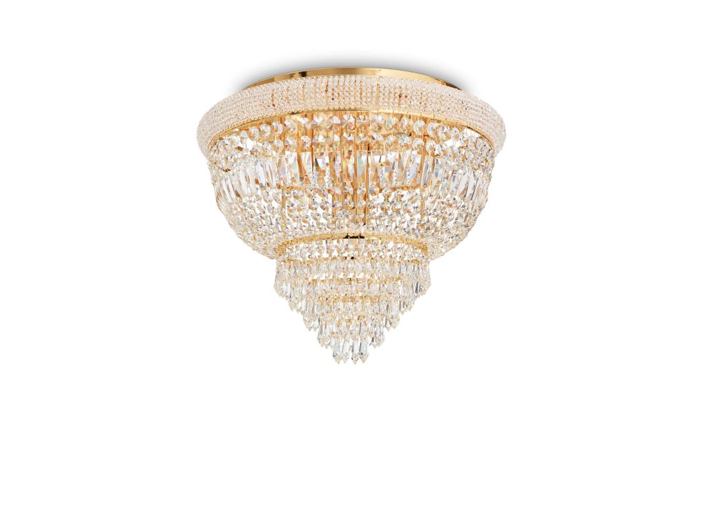 Elegantné stropné prisadené svietidlo Dubai PL6 z kolekcie interiérového osvetlenia Ideal Lux v strednom prevedení s priemerom 52 cm vhodne doladí každý interiér v modernom aj klasickom štýle. Ideálne rozsvietia haly, obývacie priestory alebo hotelové interiéry. Svietidlo tvorí kovový rám s lesklou zlatou povrchovou úpravou, ktorý je dookola ozdobený dekoratívnymi prvkami z brúseného číreho krištáľu v tvare osemuholníkov a hranolov. Štýlové svietidlo je osadené päticami E14 s maximálnym príkonom 6 x 40 W. Žiarovky nie sú súčasťou balenia. Odporúčame použiť úsporné LED svetelné zdroje s dlhou životnosťou. Dodávateľ odporúča zvoliť LED filamentové žiarovky (obj. kód 101224) s príkonom 4W a teplotou chromatickosti 3000K (neutrálna biela farba). Krytie IP20 je vhodné na použitie do interiéru.Dodatočné parametre