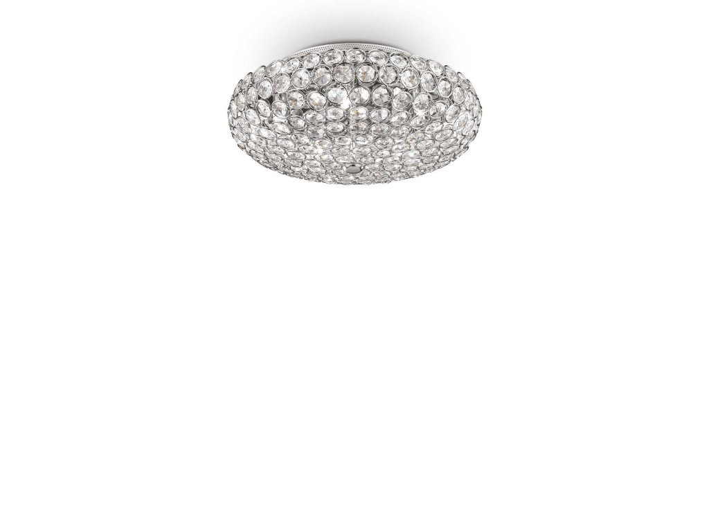 Stropné prisadené svietidlo King značky Ideal Lux v luxusnom krištáľovom prevedení s priemerom 38 cm ponúkne ideálne osvetlenie obývacej izby, spálne či kuchyne. Základňa svietidla je zhotovená z kvalitného kovu s chrómovou povrchovou úpravou. Difúzor svietidla je zložený z chrómových kovových krúžkov zdobených krištáľmi v tvare osemuholníkov. Je osadené päticami G9 pre žiarovky s maximálnym príkonom 5 x 40 W. Súčasťou balenia sú LED G9 žiarovky s príkonom 5 x 3 W so svietivosťou 5 x 370 lm a teplotou chromatickosti 3000 K. Krytie IP20 je vhodné pre použitie do interiéru. Celkové rozmery svietidla sú 16 x 38 x 38 cm. Je určené na napájanie zo siete na 220-240 V.Dodatočné parametre