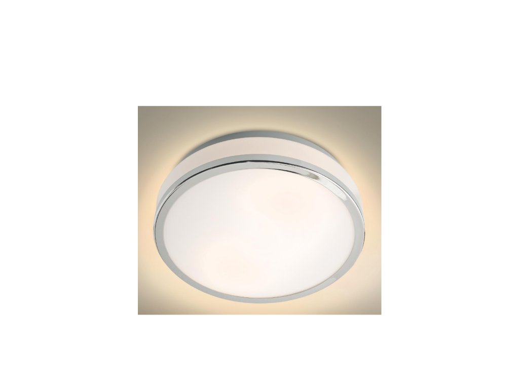 Stropné svietidlo chránené proti vlhkosti, difúzor z opálovo bieleho skla, chrómovaný kov a biely kovový rám.