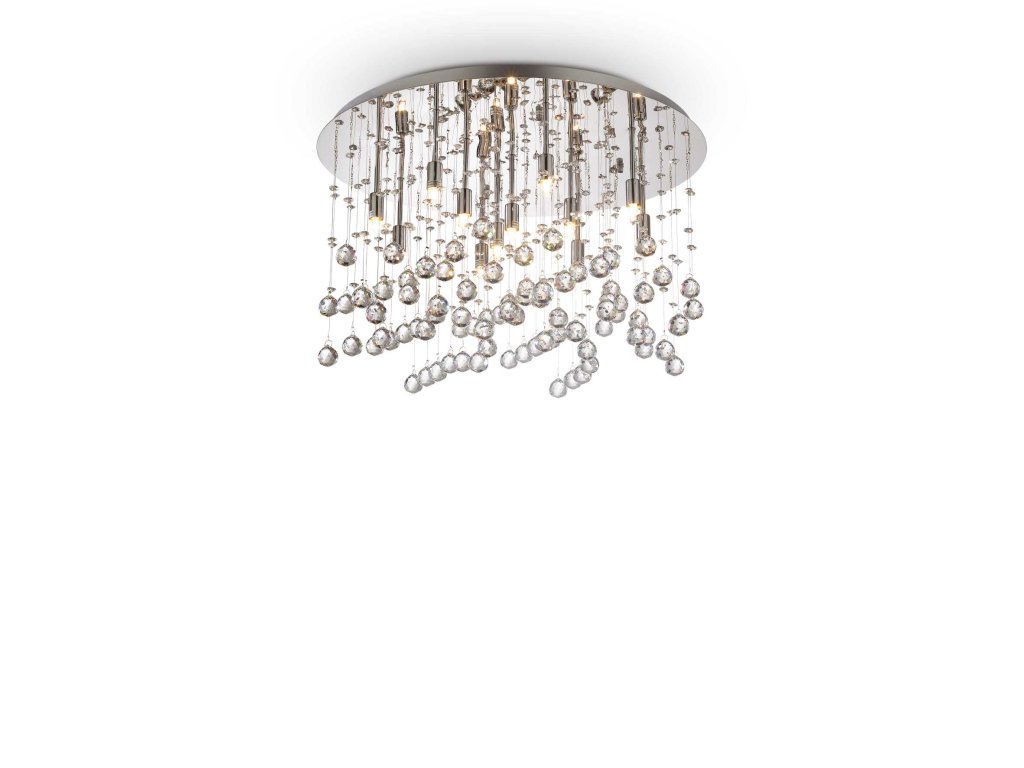 Stropné prisadené svietidlo Moonlight značky Ideal Lux v luxusnom krištáľovom prevedení s priemerom 60 cm ponúkne ideálne osvetlenie obývacej izby, spálne či kuchyne. Základňa svietidla je zhotovená z kvalitného kovu s lesklo chrómovou povrchovou úpravou. Dizajn dopĺňajú číre sklenené prívesky zložené z brúsených krištáľových gulí a osemuholníkov. Svietidlo je osadené päticami G9 pre žiarovky s maximálnym príkonom 12 x 40 W. Súčasťou balenia sú LED G9 žiarovky s príkonom 12 x 3 W so svietivosťou 12 x 370 lm a teplotou chromatickosti 3000 K. Krytie IP20 je vhodné pre použitie do interiéru. Celkové rozmery svietidla sú 36 x 60 x 60 cm. Je určené na napájanie zo siete na 220-240 V.Dodatočné parametre