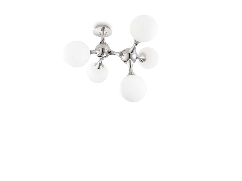 Zaujímavé stropné prisadené svietidlo Nodi z kolekcie dizajnového osvetlenia značky Ideal Lux v lesklo chrómovej farbe vhodné ako hlavné svetlo do spálne, kuchyne alebo obývačky. Svietidlo tvorí guľatá základňa a tvarované telo s piatimi ramenami, ktoré sú zhotovené z kvalitného kovu. Na konci každého ramena sú umiestnené okrúhle biele difúzory z fúkaného skla leptaného kyselinou, ktoré sú osadené päticami E14 pre žiarovky s maximálnym príkonom 5 x 40 W. Zdroje nie sú súčasťou balenia. Odporúčame zvoliť LED žiarovky pre úsporu elektrickej energie. Krytie IP20 je vhodné na použitie do interiéru. Celkové rozmery svietidla sú 55 x 55 x 50 cm. Svietidlo je určené na napájanie zo siete na 220-240 V a vzťahuje sa naň predĺžená záruka 5 rokov.Dodatočné parametre