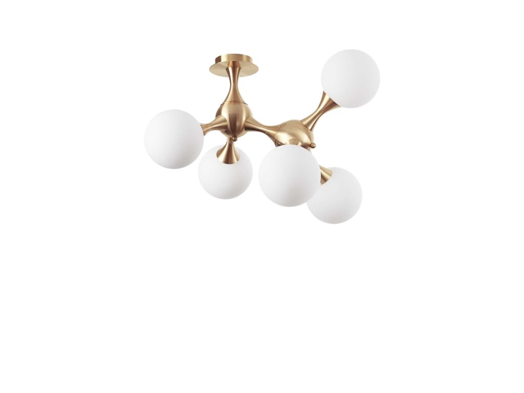 Stropné prisadené svietidlo Nodi PL5 z kolekcie interiérového dizajnového osvetlenia Ideal Lux vynikne na stenách Vašej jedálne, obývačky či spálne. Skvele sa svojím spracovaním hodí aj do reštaurácií či hotelov. Jeho nadčasovo tvarovaný rám je vyrobený z kovu s mosadznou povrchovou úpravou. Svietidlo je zložené z otočných spojovacích prvkov, ktoré je možné usporiadať podľa Vašich predstáv, a je na nich umiestnených 5 matne bielych sklenených difúzorov v tvare gulí s päticou E14 o maximálnom príkone žiaroviek 5 x 40 W. Zdroje nie sú súčasťou balenia, dodávateľ odporúča zvoliť LED filamentové žiarovky40. teplotou chromatickosti 3000K (neutrálne žlté svetlo) a svietivosťou 430lm. Krytie IP20 je určené na vnútorné použitie.Dodatočné parametre