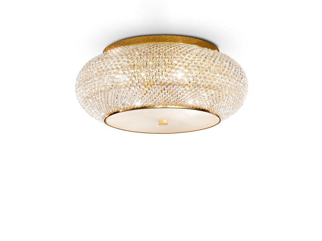 Luxusné stropné prisadené svietidlo Pasha značky Ideal Lux v krištáľovom prevedení s priemerom 55 cm ponúkne ideálne osvetlenie obývacej izby, spálne či kuchyne. Rám svietidla je zhotovený z kovu so zlatou povrchovou úpravou. Dominantou svietidla je difúzor zložený zo šnúrok brúsených krištáľových perál. Spodnú časť kryje sklenená pieskovaná tabuľa. Svietidlo je osadené päticami E14 pre žiarovky s maximálnym príkonom 10 x 40 W. Zdroje nie sú súčasťou balenia. Odporúčame zvoliť LED žiarovky, ktoré šetria elektrickú energiu. Krytie IP20 je vhodné na použitie do interiéru. Celkové rozmery svietidla sú 21 x 55 x 55 cm. Je určené na napájanie zo siete na 220-240 V a vzťahuje sa naň predĺžená záruka 5 rokov.Dodatočné parametre
