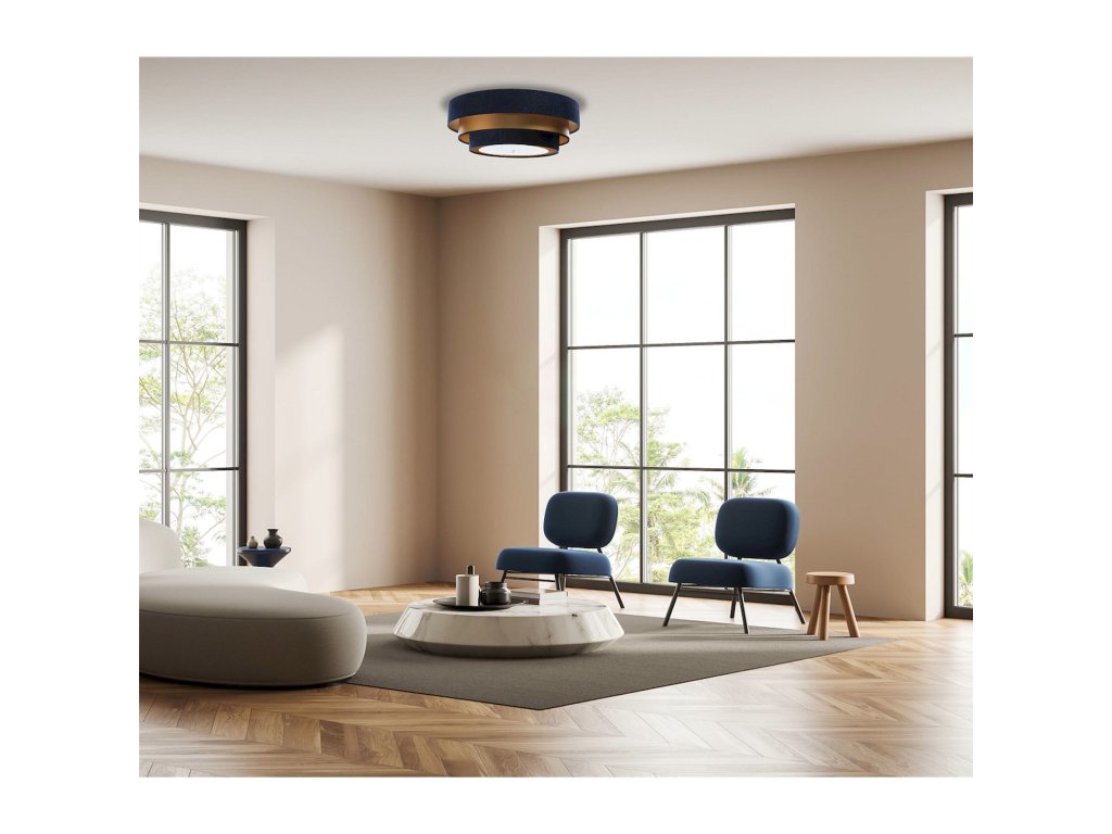 Stropné svietidlo TRINITY v dvoch farebných variantoch - modro-zlatá a zlato-modrá. Tienidlo je odolné voči UV žiareniu, takže tkanina počas používania nevybledne. Priemer svietidla je 60 cm. Skvele sa hodí do obývacej izby či spálne.