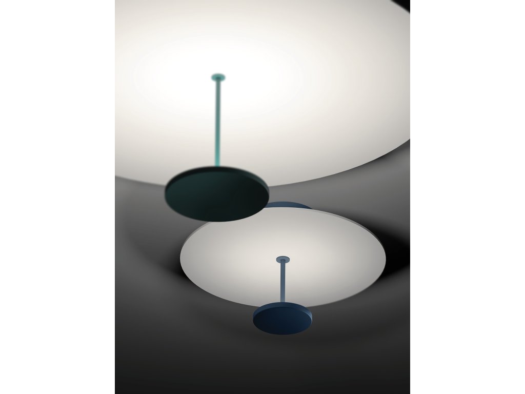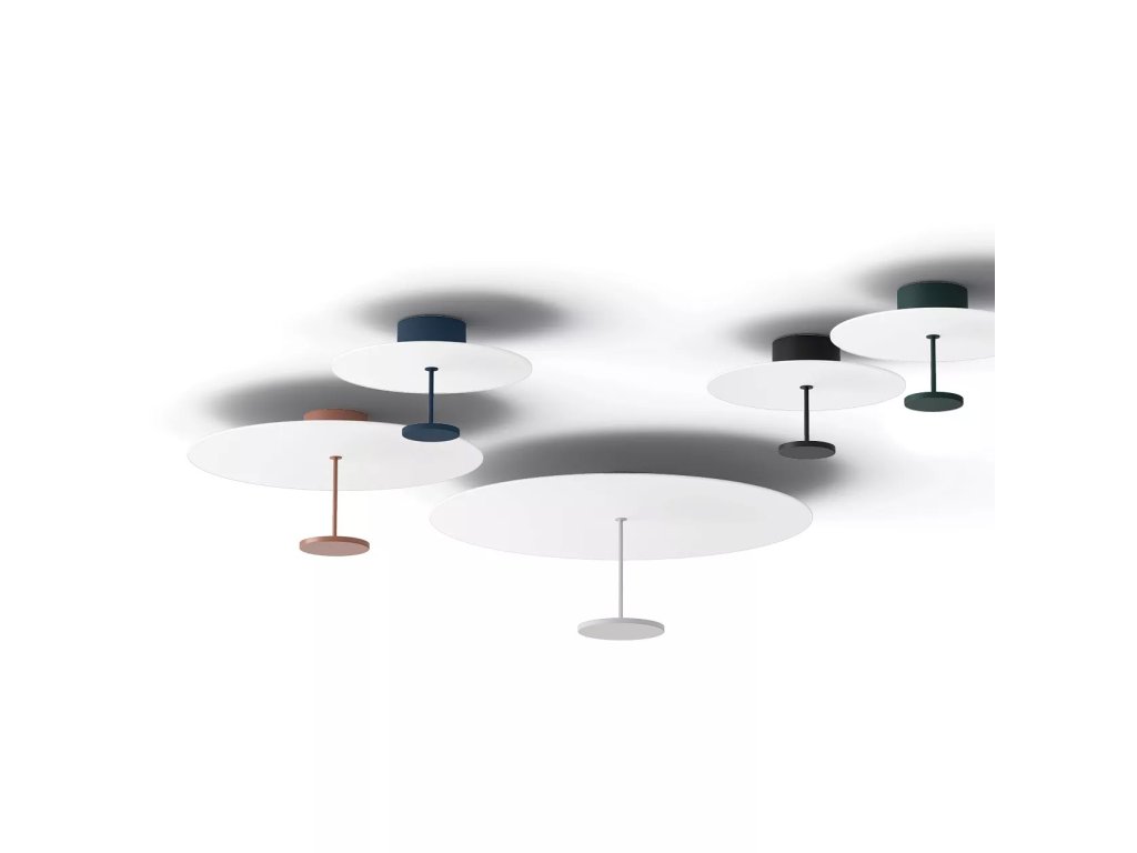 Moderní stropní svítidlo Stilo_S v pěti barevných variantách - černá, bílá, petrolejová, tmavě modrá a broskvová.