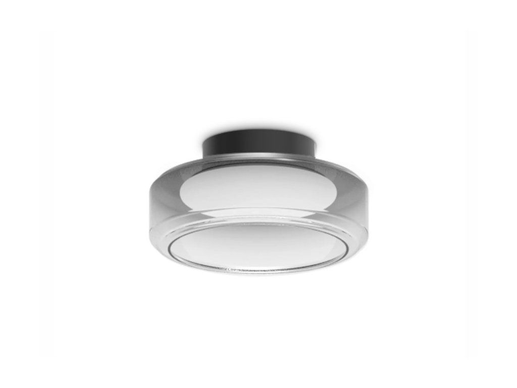 Kovový rám s matným lakem. Dvojitý skleněný difuzér: zevnitř leptaný na bílo, zvenku čirý s kouřovým odstínem v horní části.