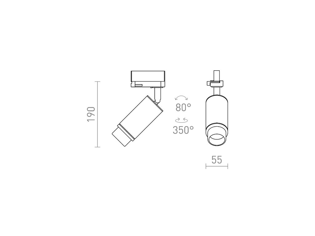 Válcové svítidlo pro tříokruhovou lištu s možností úpravy světelného kuželu pomocí zoom systému 10-50°. Svítidlo je vhodné pro LED světelné zdroje s paticí GU10. Do svítidla používejte světelné zdroje s úhlem vyzařování 120°, aby jste předešli nežádoucím stínům.