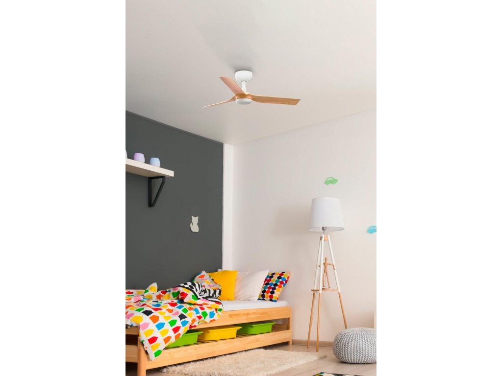 MINI PUNT S je štýlový stropný ventilátor bez svetelného zdroja. Je dostupný v štyroch farebných kombináciách - celobiele prevedenie, biele telo s lopatkami v javorovom prevedení, čierne telo s lopatkami v prevedení tmavé drevo av celočiernom prevedení. Je ideálny pre miestnosti menšie ako 13 m². Ovláda sa diaľkovým ovládačom, ktorý je súčasťou balenia. Tento stropný ventilátor so svetlom s energeticky úsporným jednosmerným motorom má 6 nastaviteľných rýchlostí a funkciu spätného chodu leto-zima.