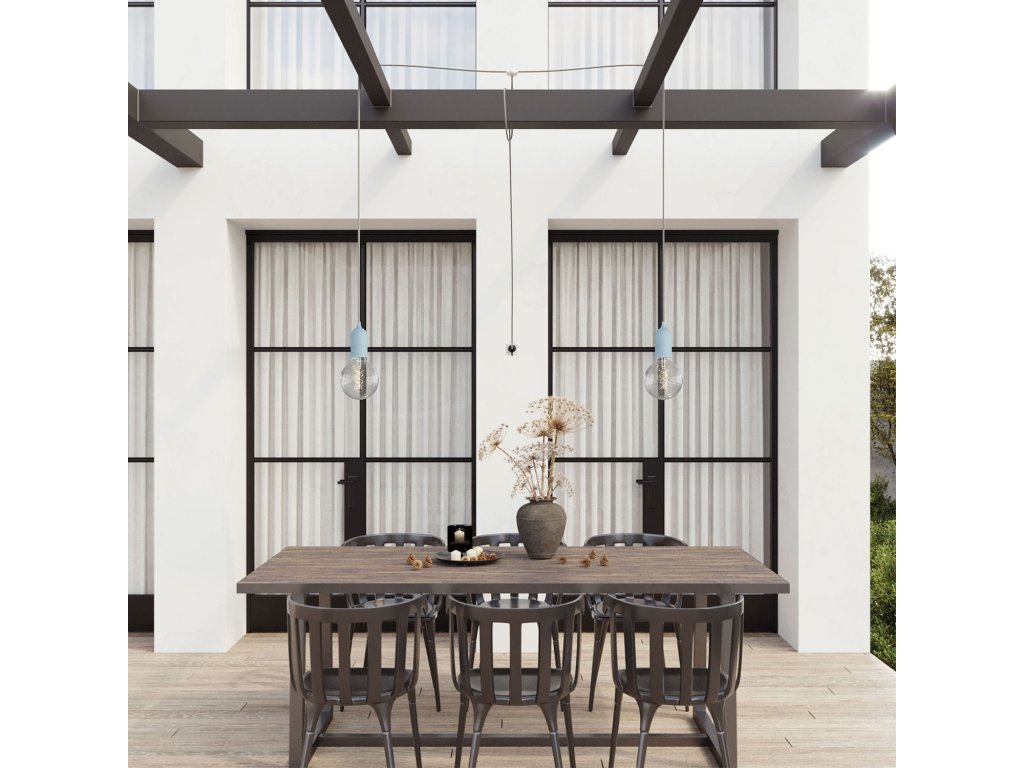 Dostupné v rôznych povrchových úpravách a 100% vyrobené v Taliansku. T-Snake je vonkajšie svietidlo na zavesenie v altánku, ktoré v lete vytvára veselú atmosféru a mnoho šťastných hodín. Možno ho použiť aj nad stolom na verande pre tých, ktorí majú radi dlhé rozprávanie ak nemu karty alebo dosky. Lampa v tomto prevedení zahŕňa odhalené žiarovky a bola navrhnutá s dvoma objímkami a spojovacou krabičkou pre osvetľovací systém z vonkajšej kolekcie EIVA od spoločnosti Creative-Cables: každý komponent má stupeň ochrany IP65, je odolná proti vode a dažďu a je dodávaná s neoprénovým káblom s textilným poťahom a zástrčkou Schuko, ideálna pre vonkajšie priestory.