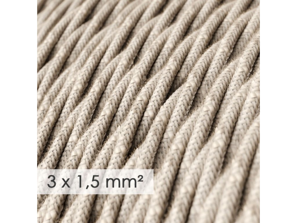 Potrebujete viac elektriny? Tento textilný elektrický kábel so širším priemerom 3x1,5 - ľanový špirálový kábel prírodnej neutrálnej farby TN01, je ideálny pre vytvorenie vlastnej predlžovačky, pre rozvody elektrickej siete alebo jednoducho všade kde chcete priviesť elektrinu vašim elektrickým zariadeniam. Elektrický kábel má dvojakú izoláciu z ohybného PVC. Všetky káble Creative-Cables sú 100% vyrábané v Taliansku s IMQ-Har certifikátom. Upozornenie! Naše elektrické káble so širším priemerom 3x1,50 mm² nie sú hrúbkou kompatibilné s našimi stropnými rozetami a objímkami.