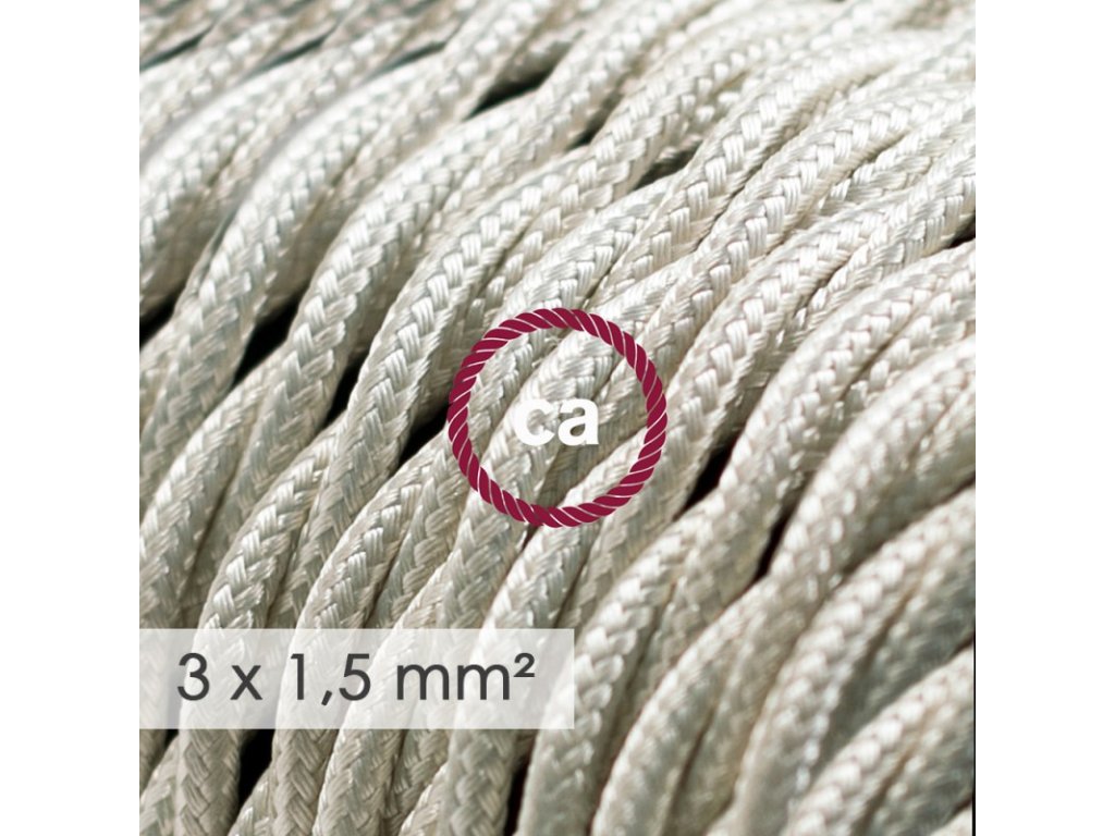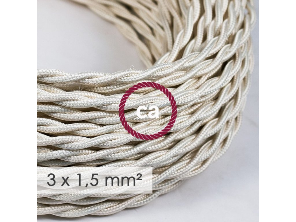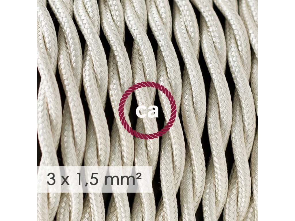 Potrebujete viac elektriny? Tento textilný elektrický kábel so širším priemerom 3x1,5 - umelý hodváb TM00 slonovinový, je ideálny na vytvorenie vlastnej predlžovačky, na rozvody elektrickej siete alebo jednoducho všade kde chcete priviesť elektrinu vašim elektrickým zariadeniam. Elektrický kábel má dvojakú izoláciu z ohybného PVC. Všetky káble Creative-Cables sú 100% vyrábané v Taliansku s IMQ-Har certifikátom. Upozornenie! Naše elektrické káble so širším priemerom 3x1,50 mm² nie sú hrúbkou kompatibilné s našimi stropnými rozetami a objímkami. Špecifikácia: