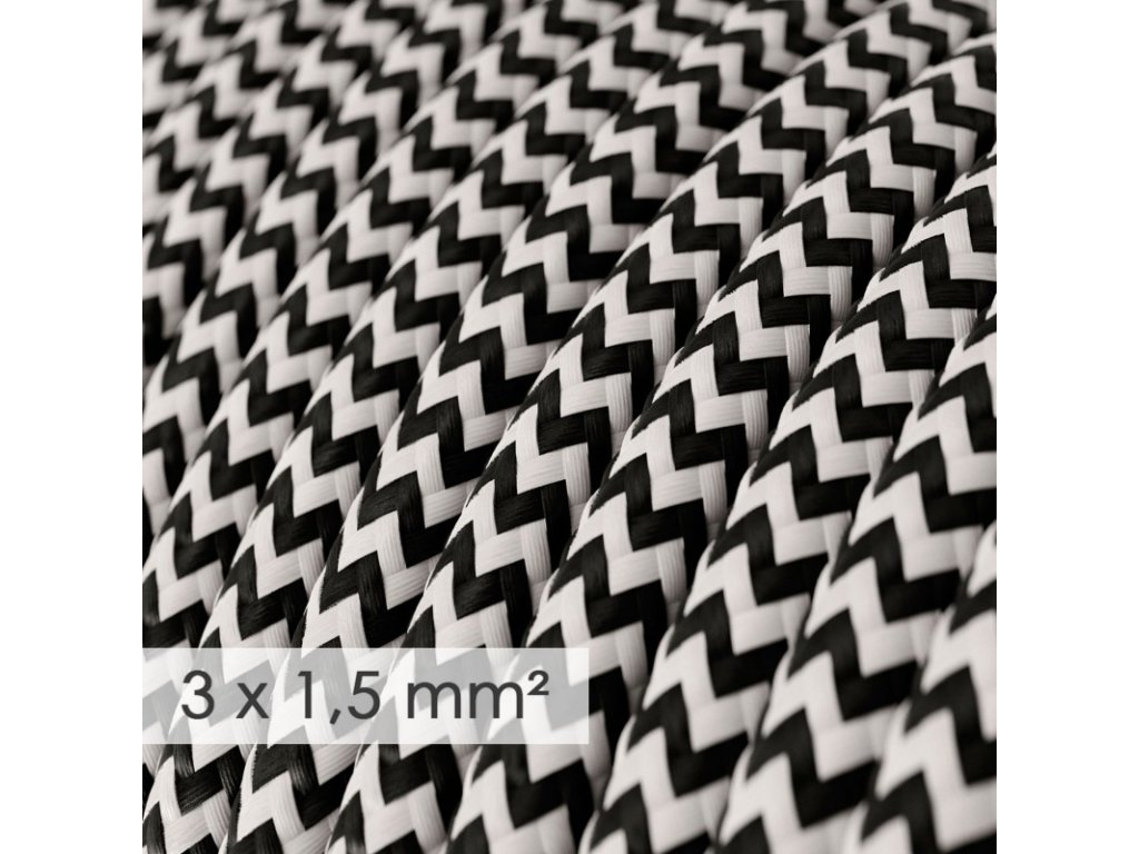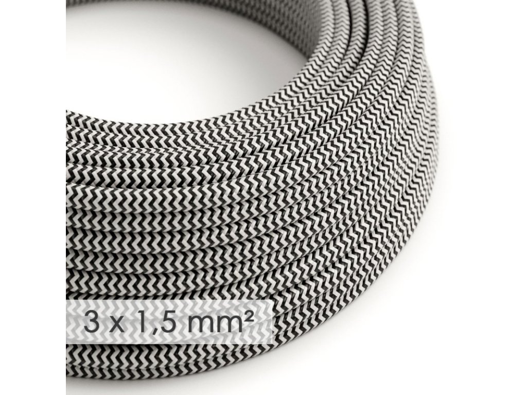 Potrebujete viac elektriny? Tento textilný elektrický kábel so širším priemerom 3x1,5 - umelý hodváb cik cak RZ04 čierny, je ideálny pre vytvorenie vlastnej predlžovačky, pre rozvody elektrickej siete alebo jednoducho všade kde chcete priviesť elektrinu vašim elektrickým zariadeniam. Elektrický kábel má dvojakú izoláciu z ohybného PVC. Všetky káble Creative-Cables sú 100% vyrábané v Taliansku s IMQ-Har certifikátom. Upozornenie! Naše elektrické káble so širším priemerom 3x1,50 mm² nie sú hrúbkou kompatibilné s našimi stropnými rozetami a objímkami.