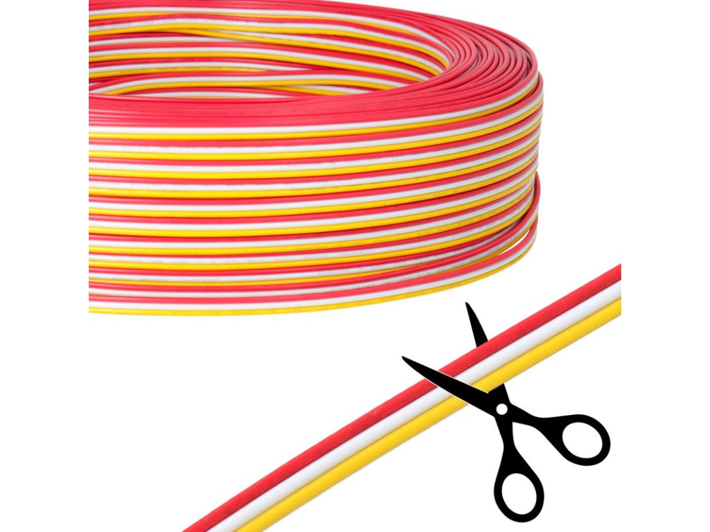 3-žilový kabel s vodiči AWG 20, barva červená/bílá/žlutá. Kabel obsahuje tři měděné vodiče o průřezu 0,5 mm2. Používá se k připojování a propojování double white (CCT) LED pásků. Při zapojení volte maximální délku a vhodný průřez vodiče vždy s ohledem na přípustný úbytek napětí, který na vodiči vzniká průchodem proudu.