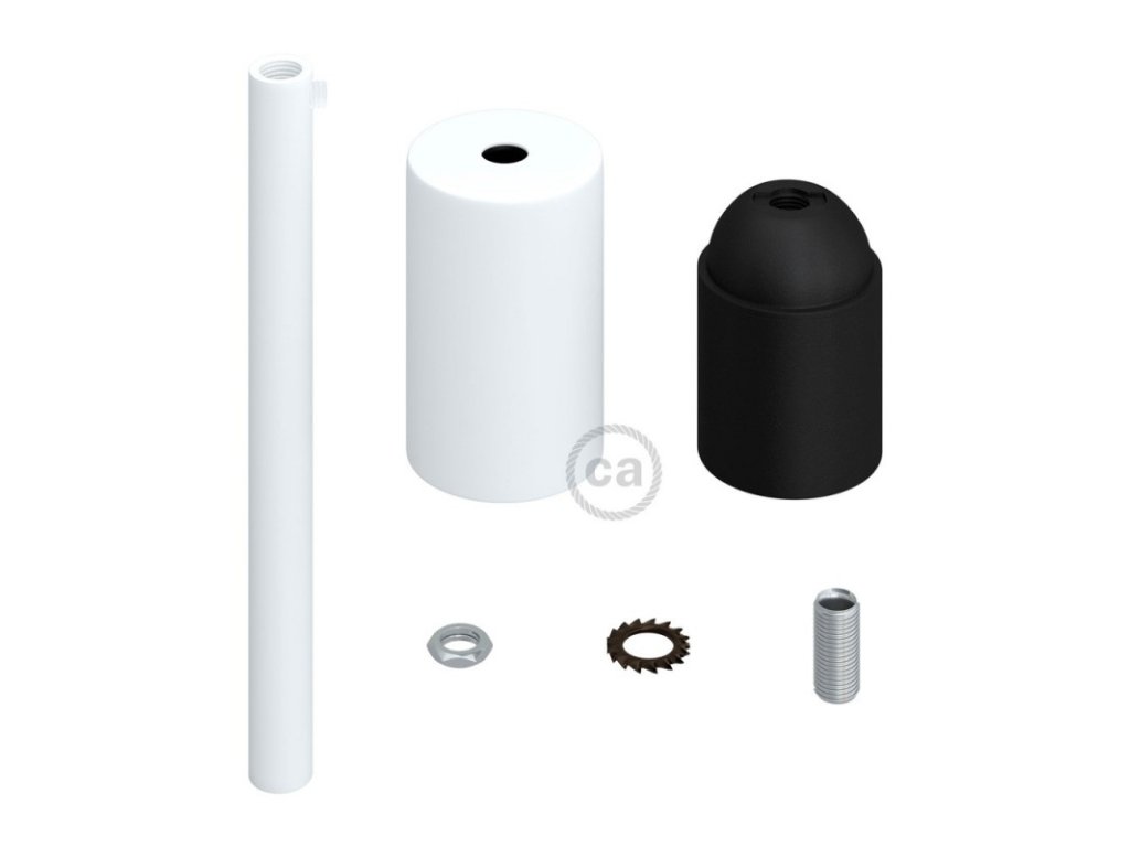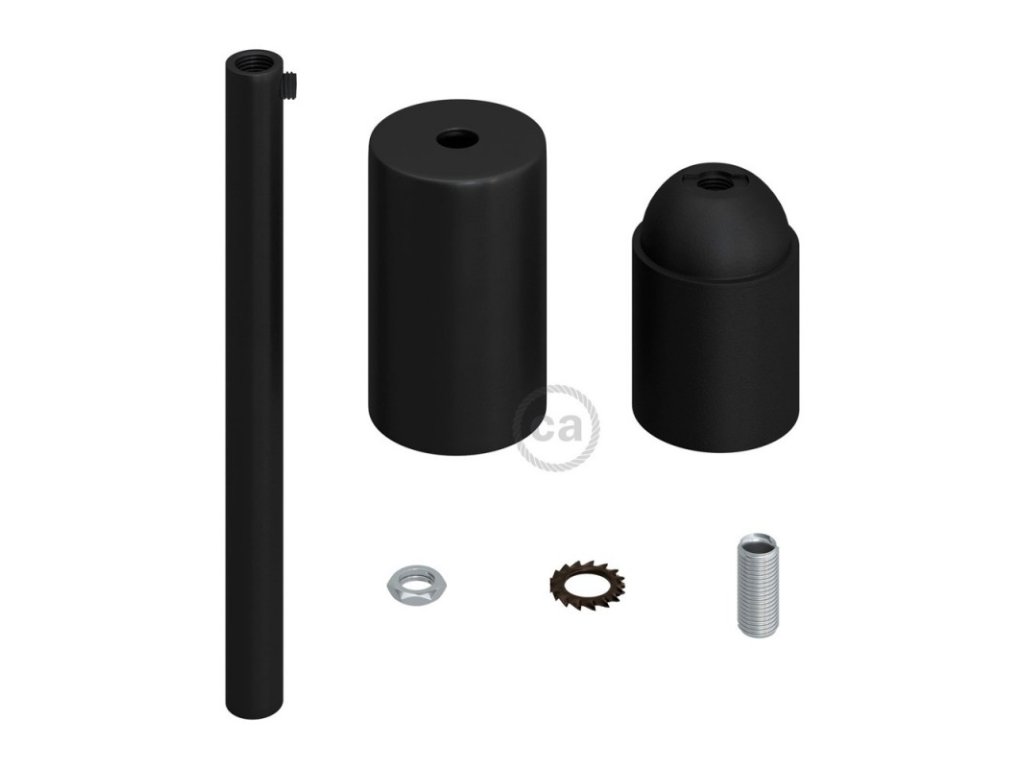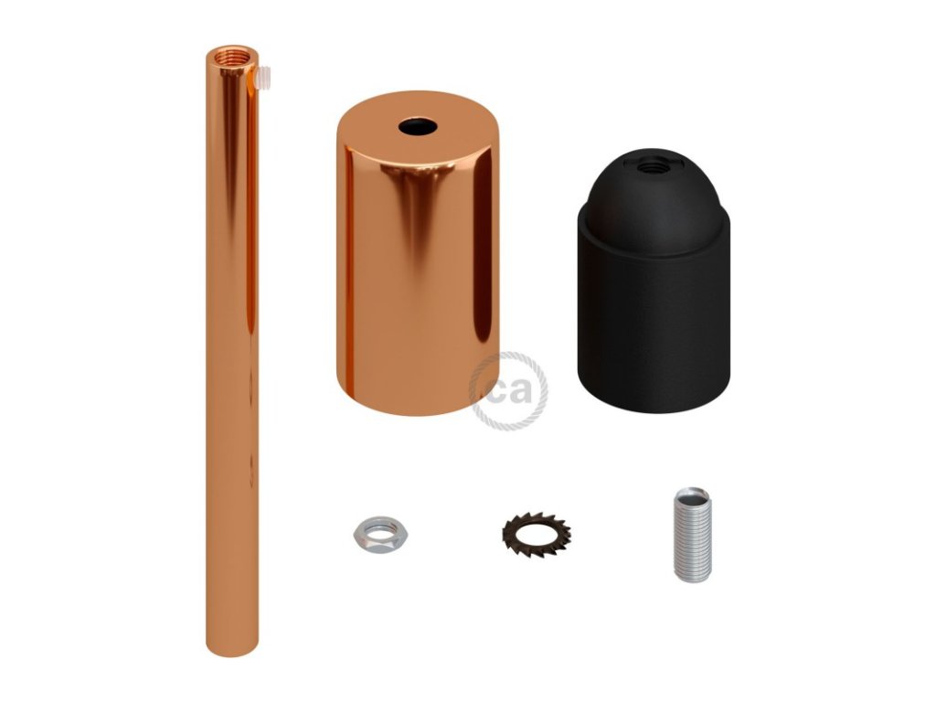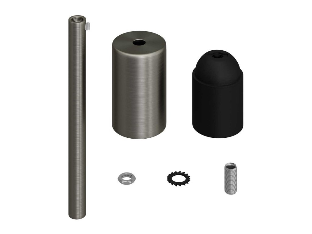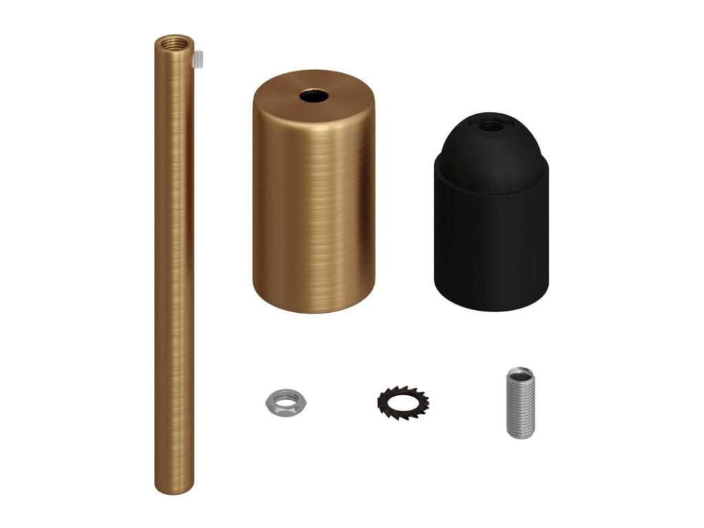Valcová objímka v sade je zložená z malej krytky, objímky E27 a 15 cm kovovej valcovej káblovej priechodky a je ideálna na vytvorenie závesnej lampy. Stačí zakúpiť (nie je súčasťou) Váš obľúbený textilný kábel a stropný baldachýn.