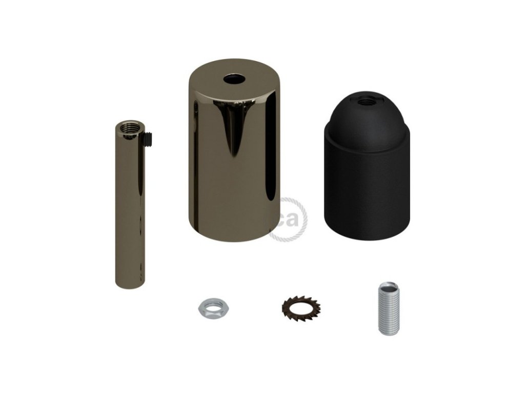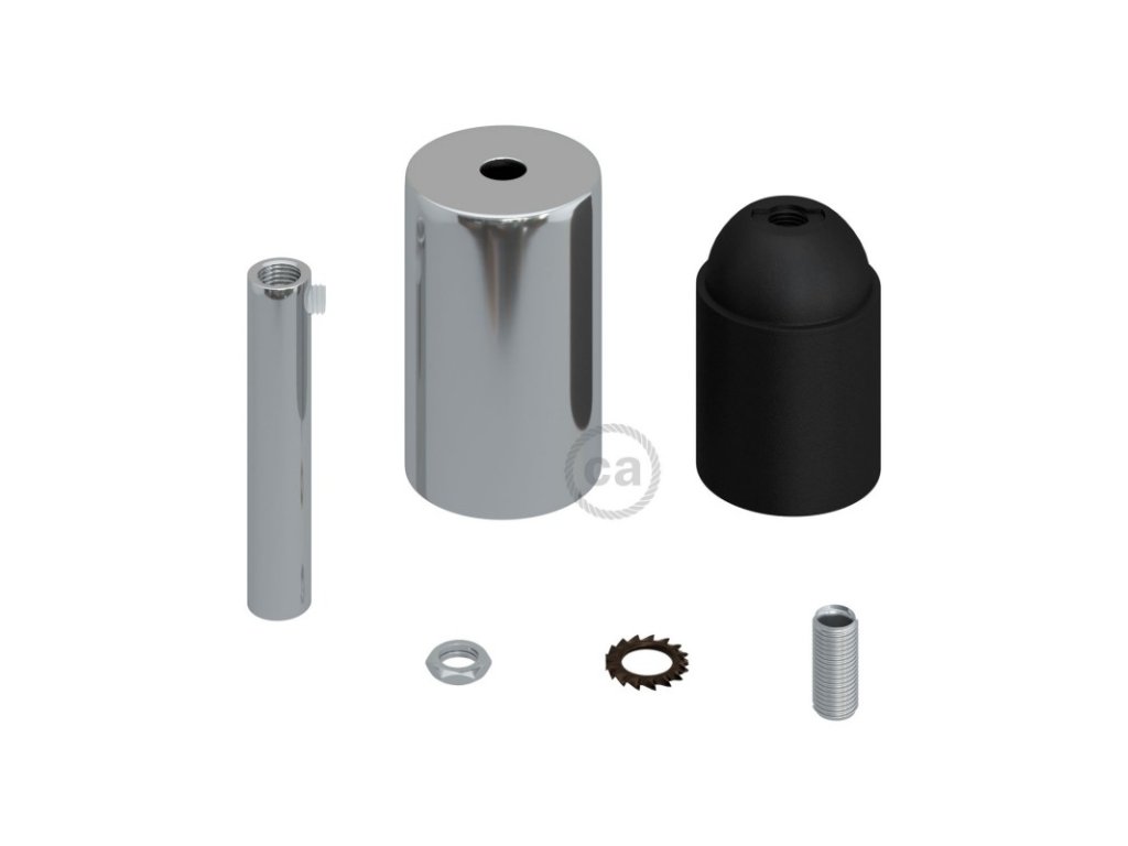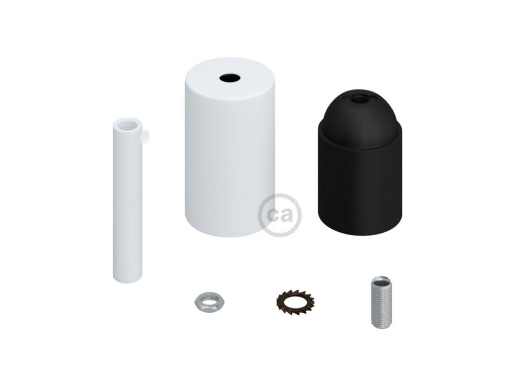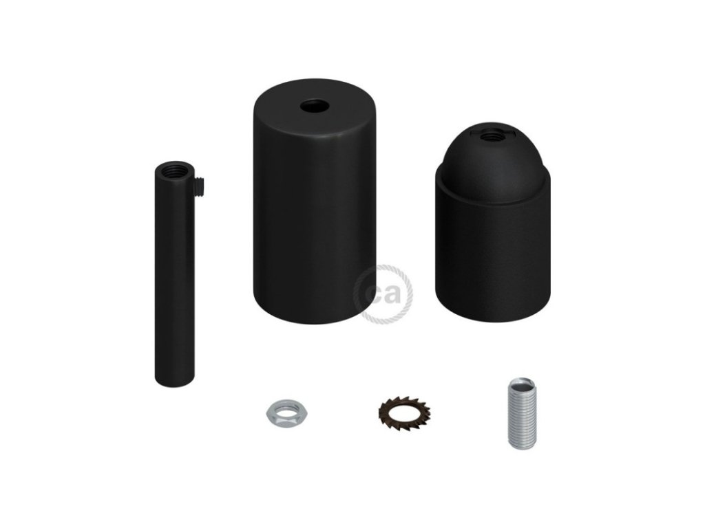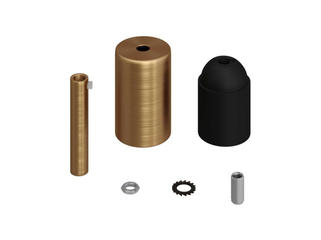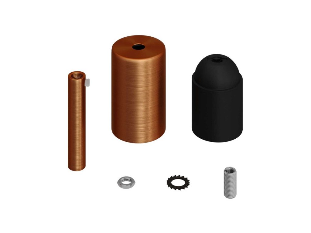 Valcová objímka v sade je zložená z malej krytky, objímky E27 a 7 cm kovovej valcovej káblovej priechodky a je ideálna na vytvorenie závesnej lampy. Stačí zakúpiť (nie je súčasťou) Váš obľúbený textilný kábel a stropný baldachýn.