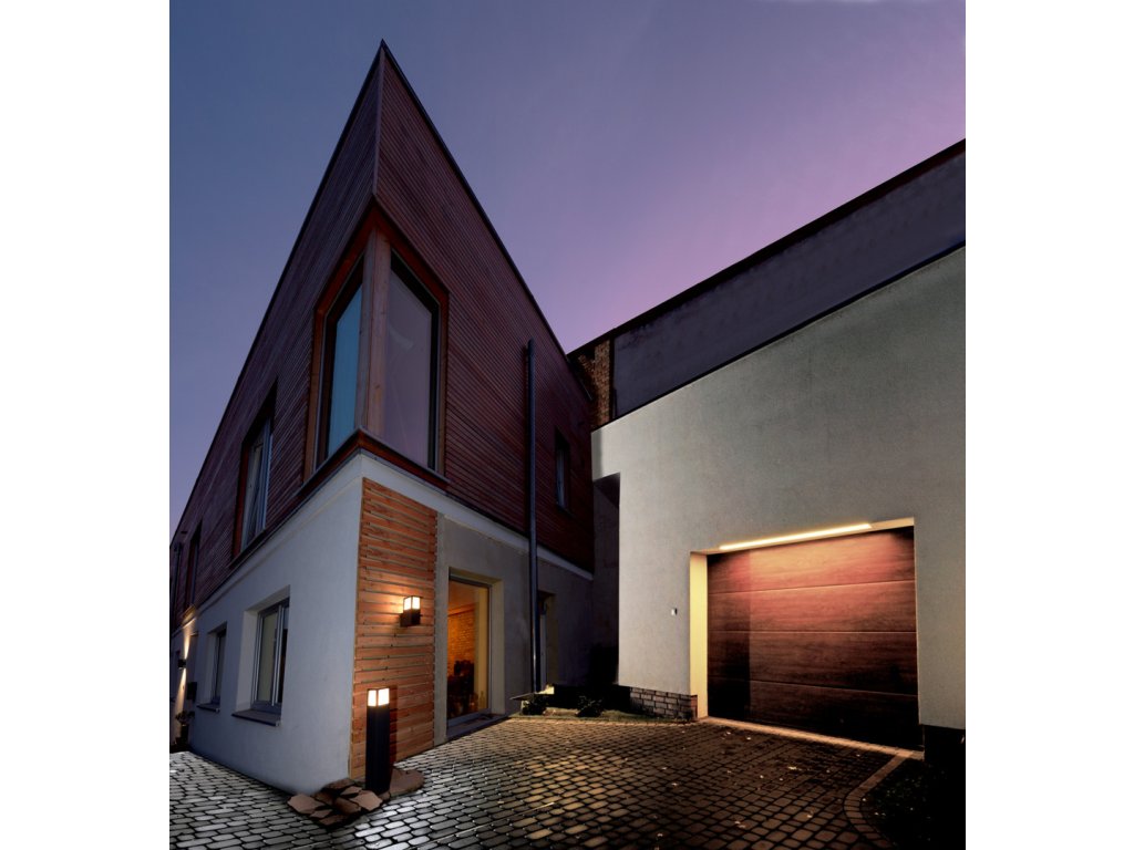 Venkovní nástěnné svítidlo Facadov hranatém tvaru v černé barvě s opálovým difuzorem.