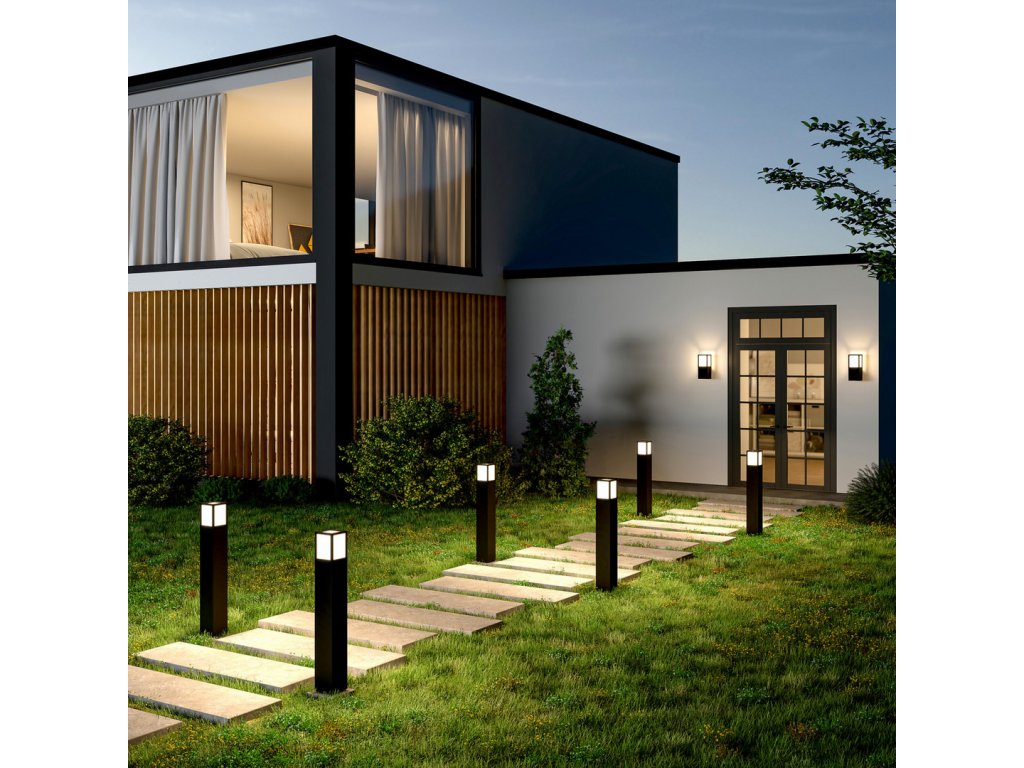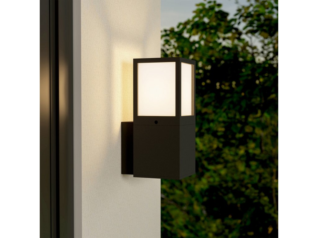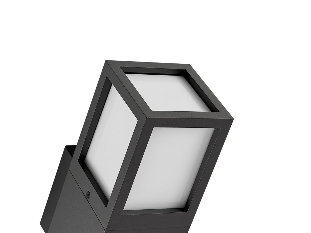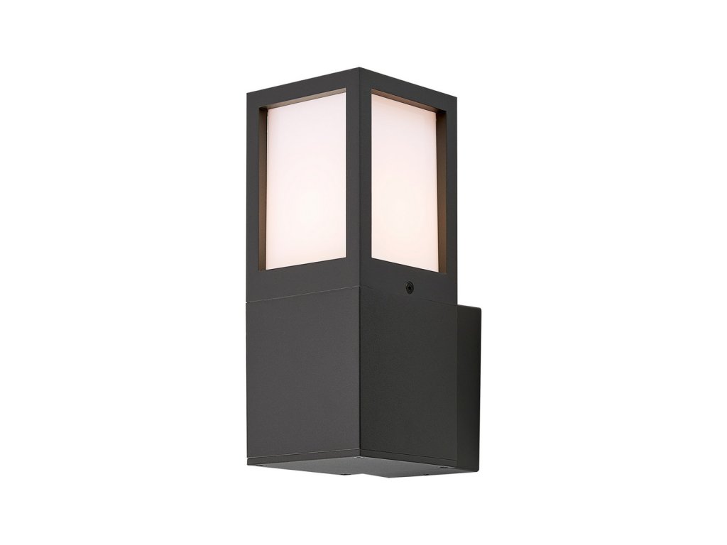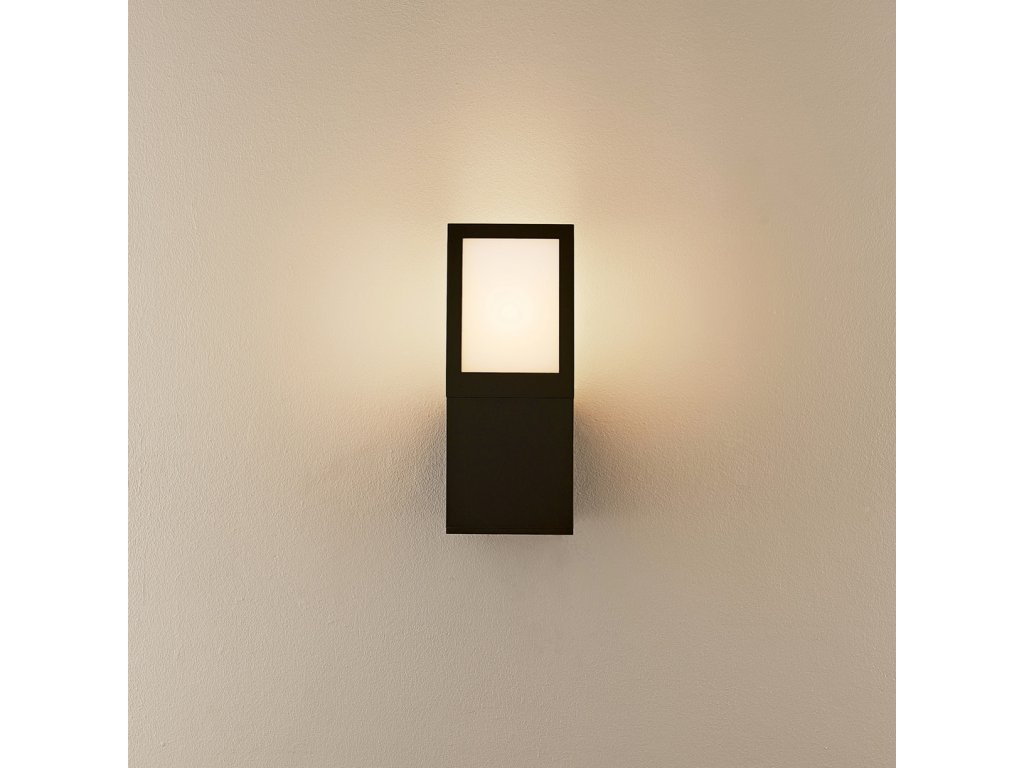 Venkovní nástěnné svítidlo Facado v hranatém tvaru v černé barvě se dvěmi typy difuzoru - opálový a tónovaný.