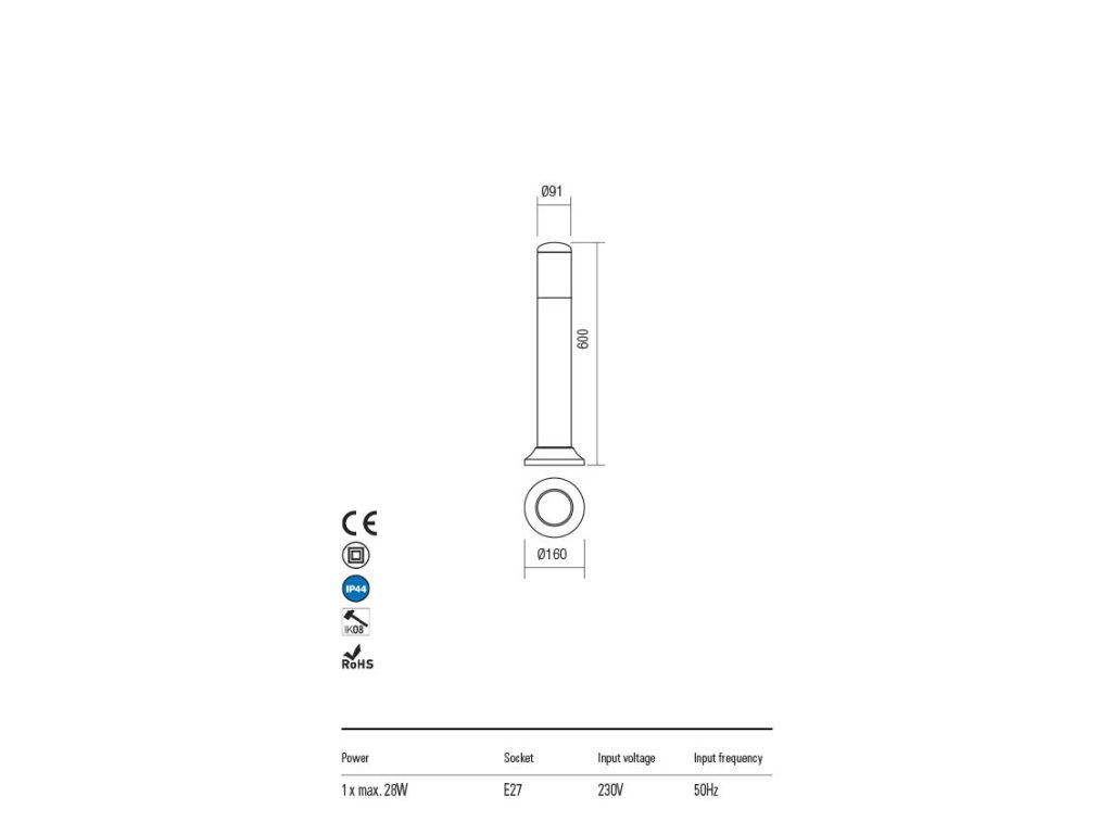 Vonkajší záhradný stĺpik má čiernu konštrukciu z ABS a polykarbonátu a opálový polykarbonátový difúzor. Vonkajší záhradný stĺpik PENCIL má ochranné krytie IP44, napájanie 220-240V. Žiarovka nie je súčasťou balenia.Dodatočné parametre