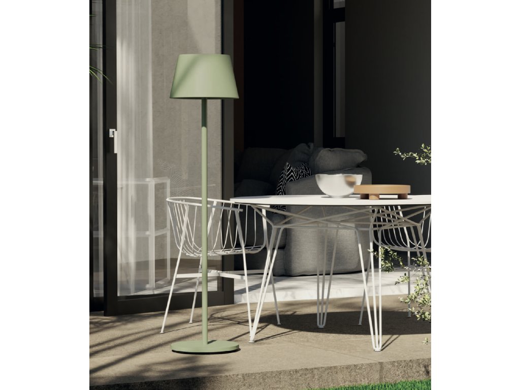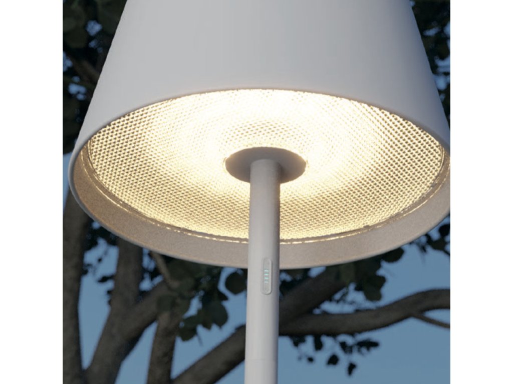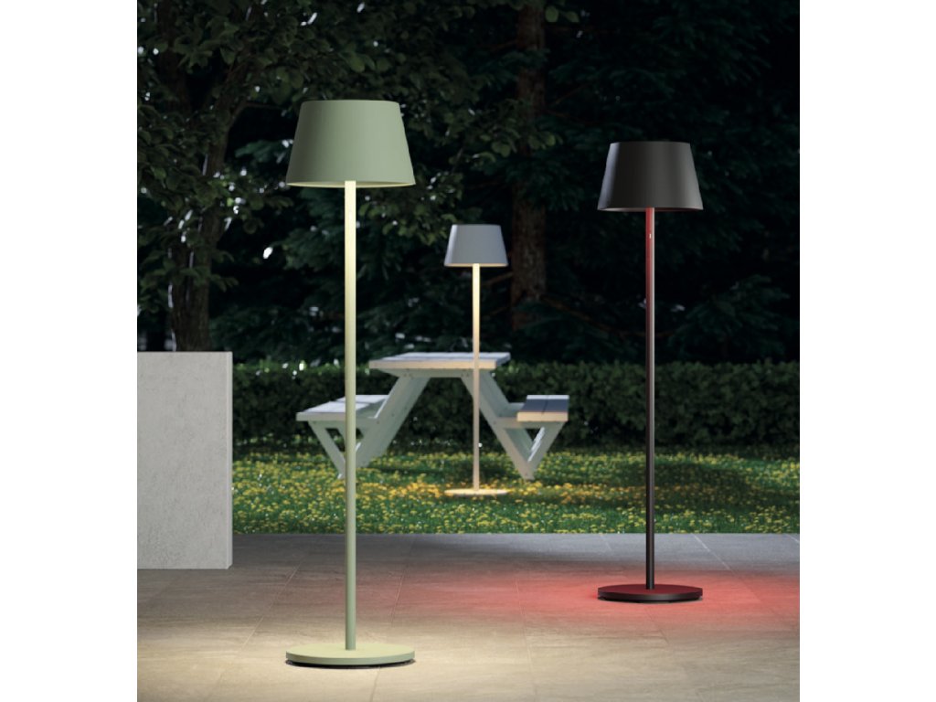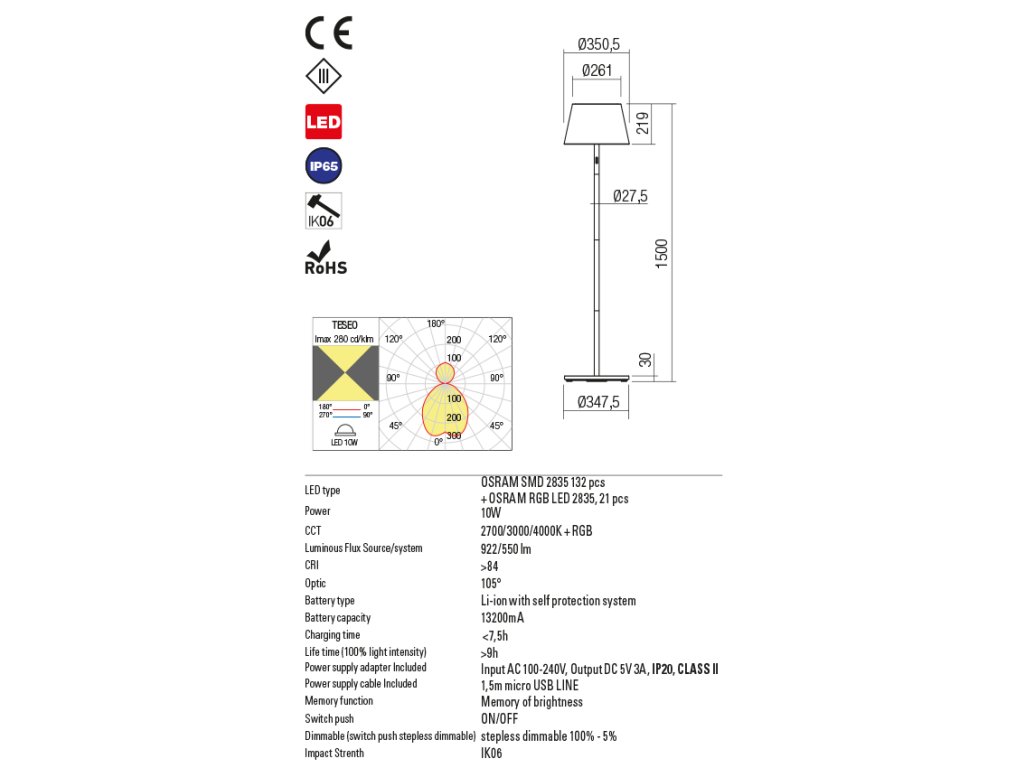 Vonkajšia stojacia lampa vybavená LED diódami SMD a RGB, indikátorom stavu nabitia batérie a 2 dotykovými spínačmi (s dotykovým senzorom): dotykovým stmievačom od 100 % do 5 % s pamäťou jasu a CCT a dotykovým spínačom RGB s možnosťou zmeny teploty farby svetla 2700K/300 farieb). Vybavené Li-ion batériou typu 18650, kapacita 13 200 mA, s ochranou proti prebitiu, kontaktnou nabíjačkou (súčasťou dodávky) pri 100 - 240 V, 50/60 Hz, 5 V/3 A. Maximálna doba nabíjania 7,5 hodiny. Telo z tlakovo liateho hliníka lakované matnou čiernou, bielou alebo zelenou farbou, číry polykarbonátový difúzor.