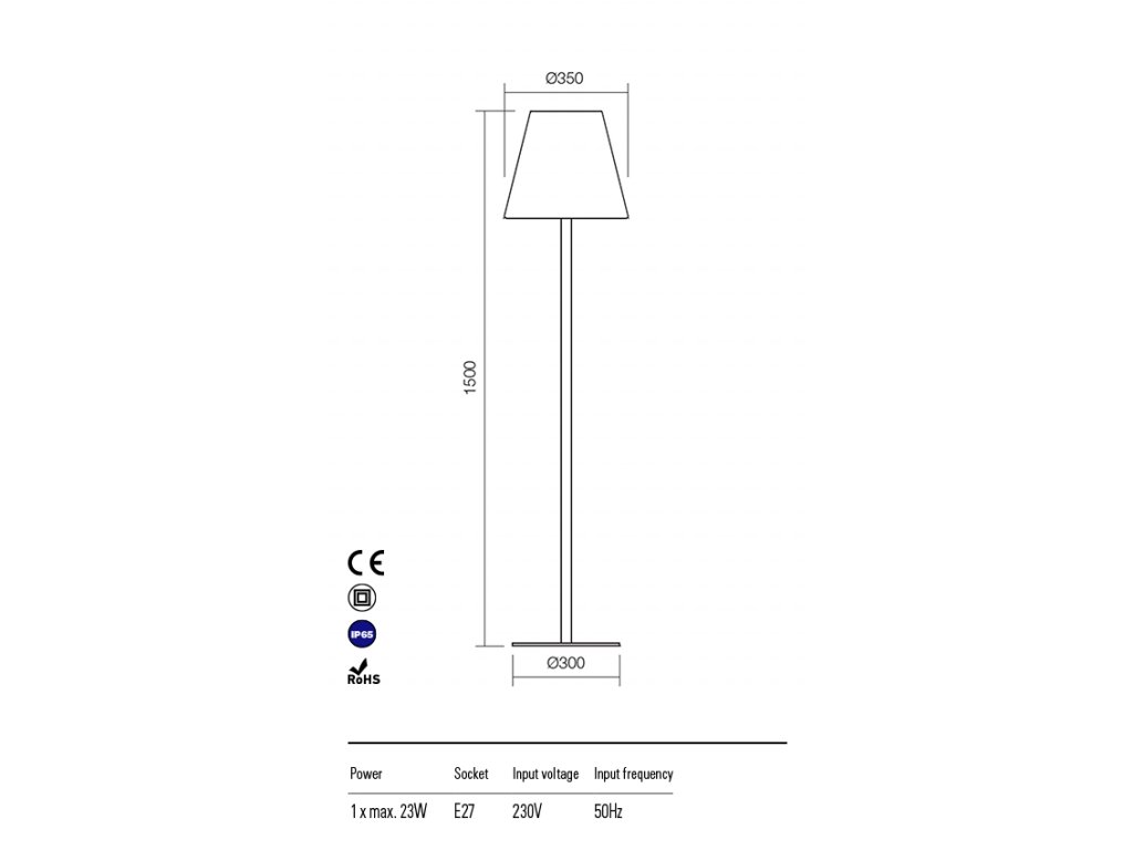Vonkajšia stojacia lampa, kovová konštrukcia a tienidlo z polyetylénu, odolné proti UV žiareniu. Dodáva sa s 3m káblom s vidlicou a spínačom.Dodatočné parametre