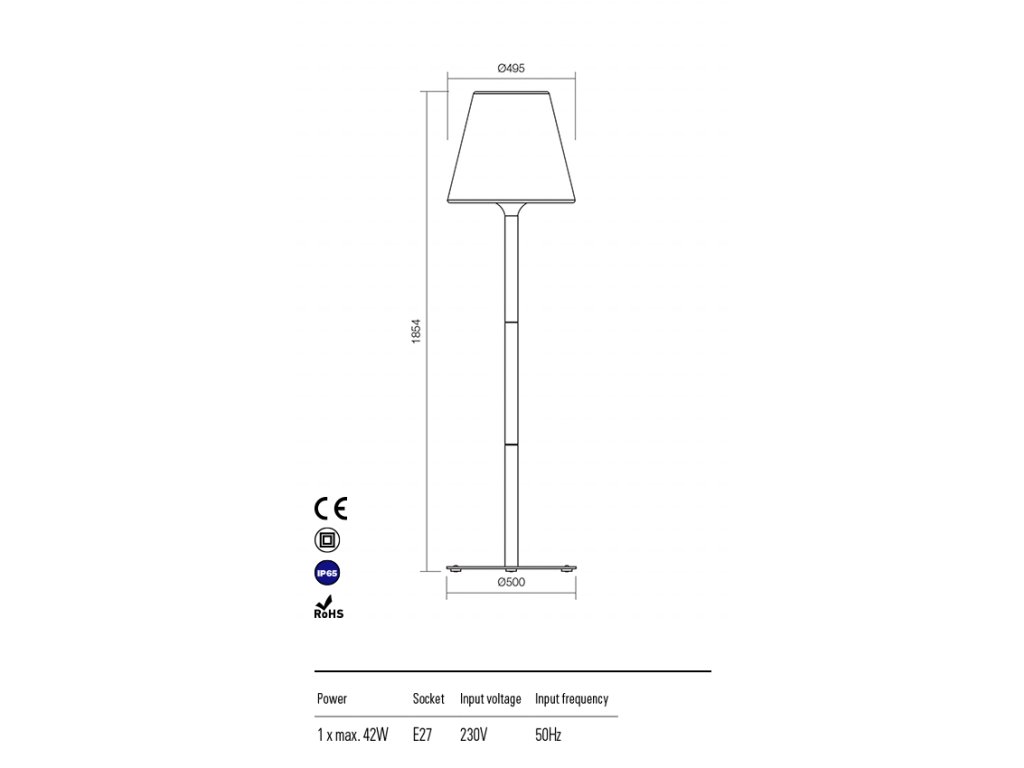 Vonkajšia stojacia lampa, kovová konštrukcia a tienidlo z polyetylénu, odolné proti UV žiareniu. Dodáva sa s 3m káblom s vidlicou a spínačom.Dodatočné parametre