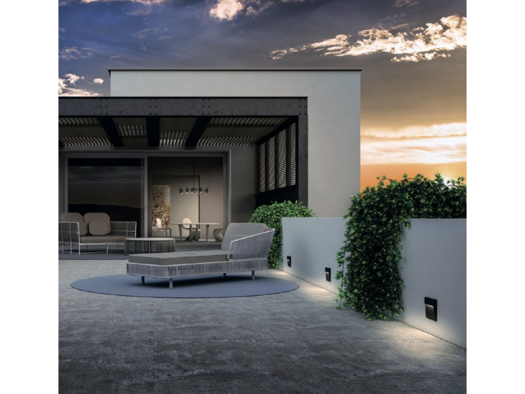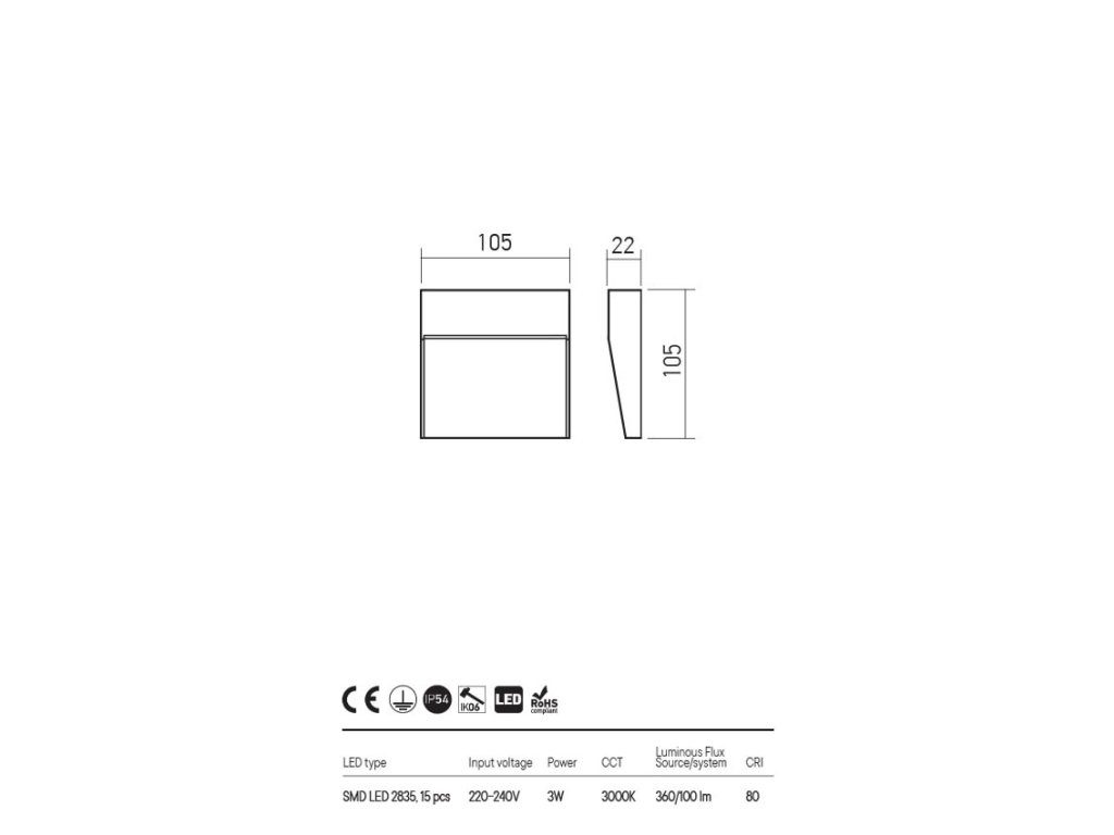 Vonkajšie nástenné svietidlo vybavené SMD LED diódami, telo z tlakovo liateho hliníka elektrostaticky lakované matnou bielou alebo antracitovou farbou, číry polykarbonátový difúzor.