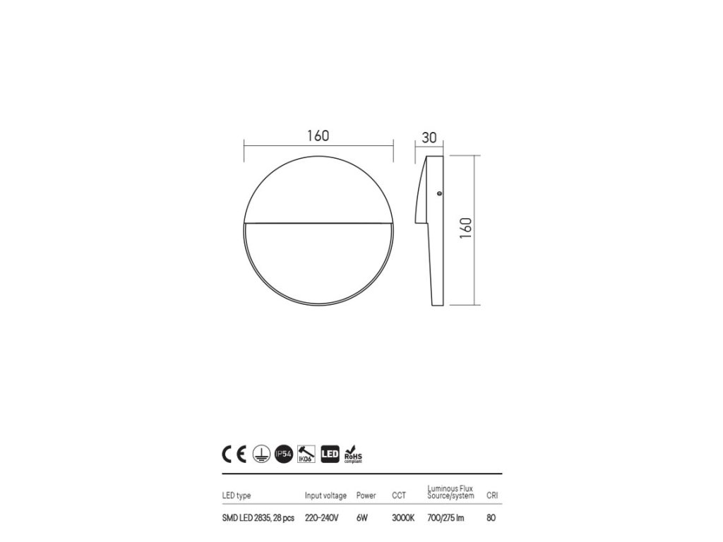 Vonkajšie nástenné svietidlo vybavené SMD LED diódami, telo z tlakovo liateho hliníka elektrostaticky lakované matnou bielou alebo antracitovou farbou, číry polykarbonátový difúzor.